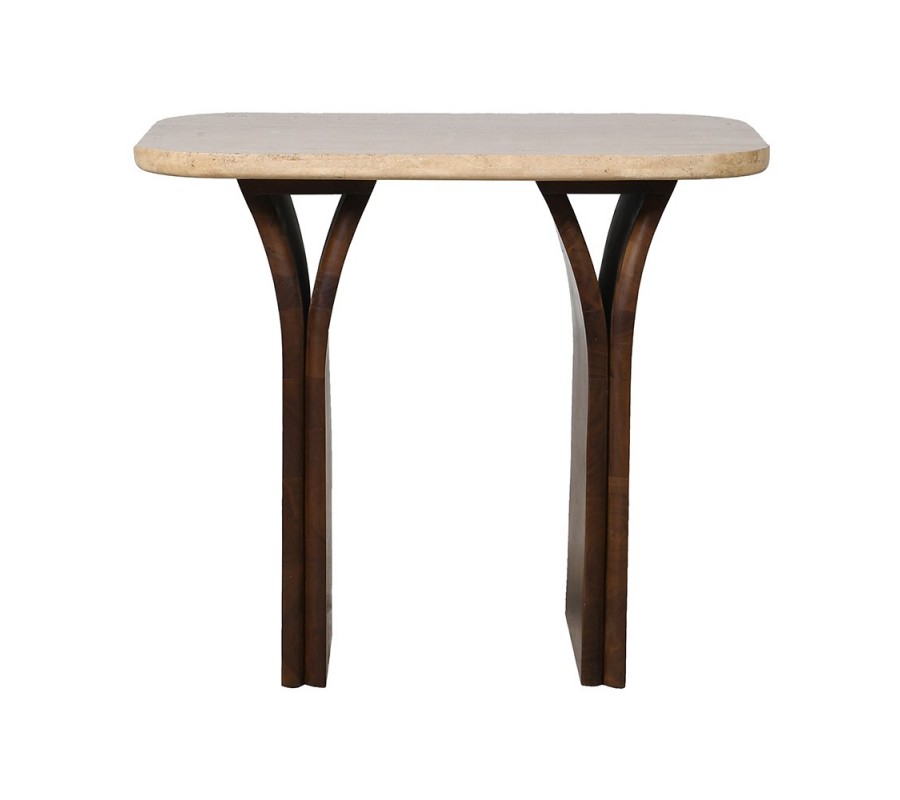 Luxusný dizajnový obdĺžnikový travertínový príručný stolík Jedy v béžovej farbe s hnedými drevenými nožičkami 68 cm