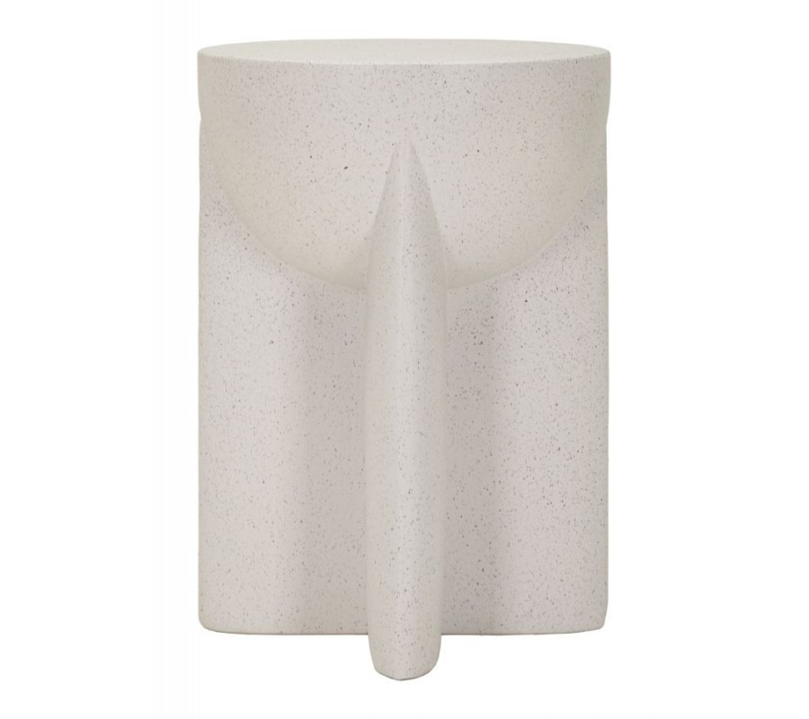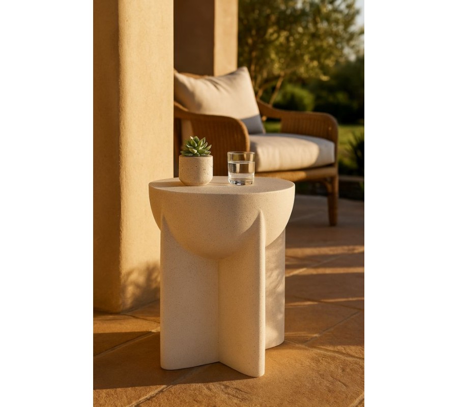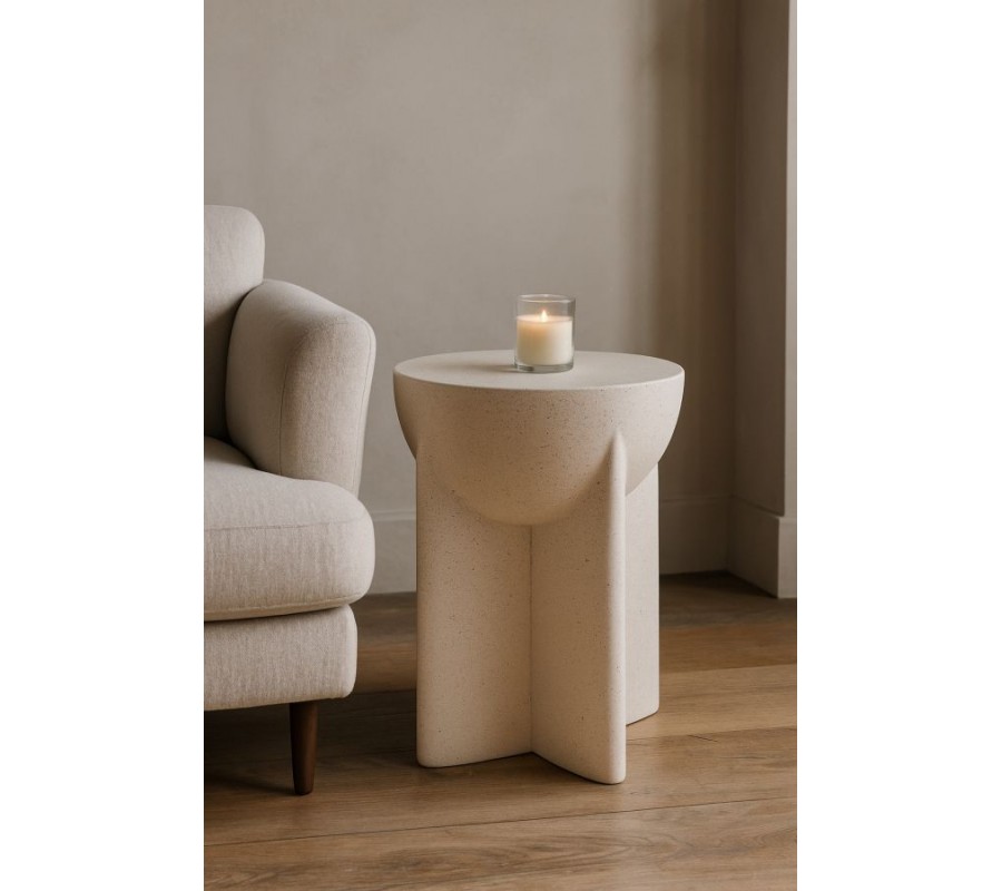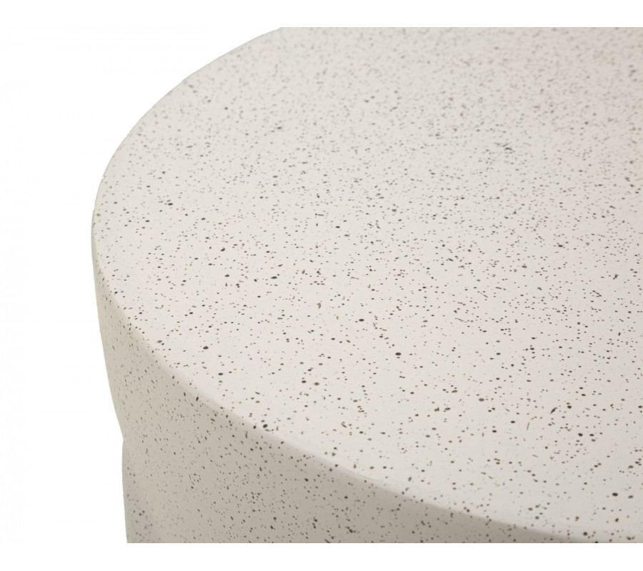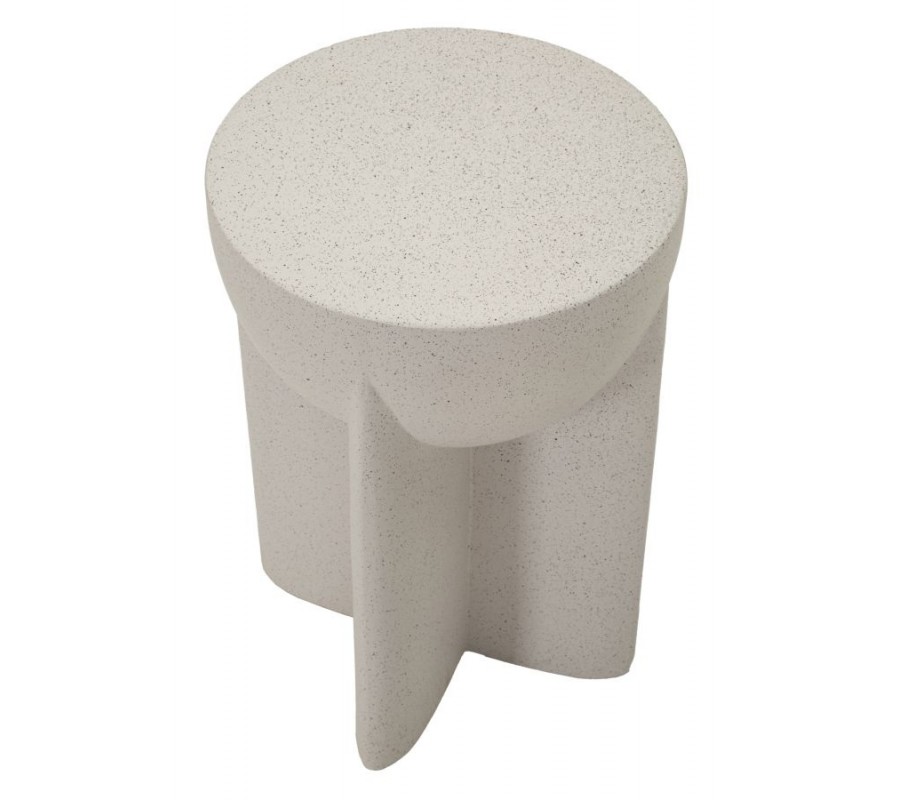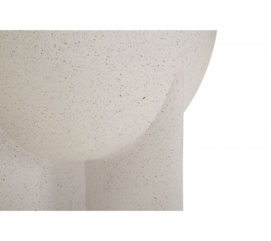 Stolík je vyrobený z horčíkového kompozitu MGO, ktorý sa vyznačuje vysokou pevnosťou a odolnosťou. Svojím vzhľadom a svetlým sivým prevedením pripomína betón. Drobné tmavšie zrná dodávajú povrchu jemnú štruktúru a vzhľad prírodného kameňa. Materiál tak pôsobí moderne a zároveň naturálne, s teplým charakterom.