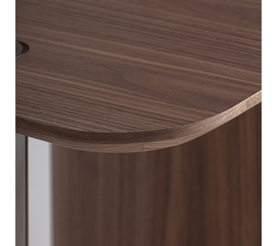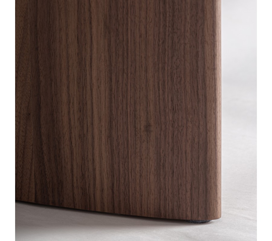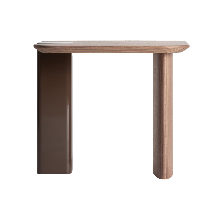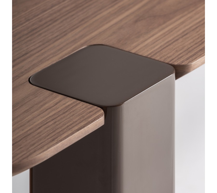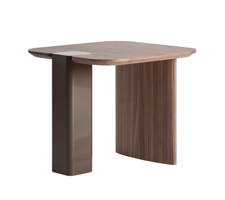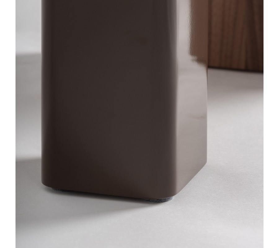 Vrchná doska má jemne zaoblený štvorcový tvar, ktorý pôsobí elegantne a kompaktne. Zaujímavým prvkom je konštrukcia podnože – stolík stojí na dvoch odlišných nohách, ktoré vytvárajú architektonický kontrast. Jedna noha má štvorcový tvar s hladkým lesklým čokoládovým lakom, zatiaľ čo druhá je podlhovastá, mierne oválne tvarovaná a vyhotovená z pravej dubovej dyhy s výraznou kresbou dreva. Spoj tejto štvorcovej lakovanej nohy s doskou je priznaný a viditeľný z vrchnej strany, čo podčiarkuje moderný konštrukčný detail a dodáva stolíku charakter dizajnového objektu.