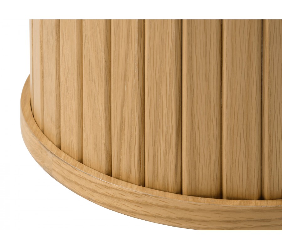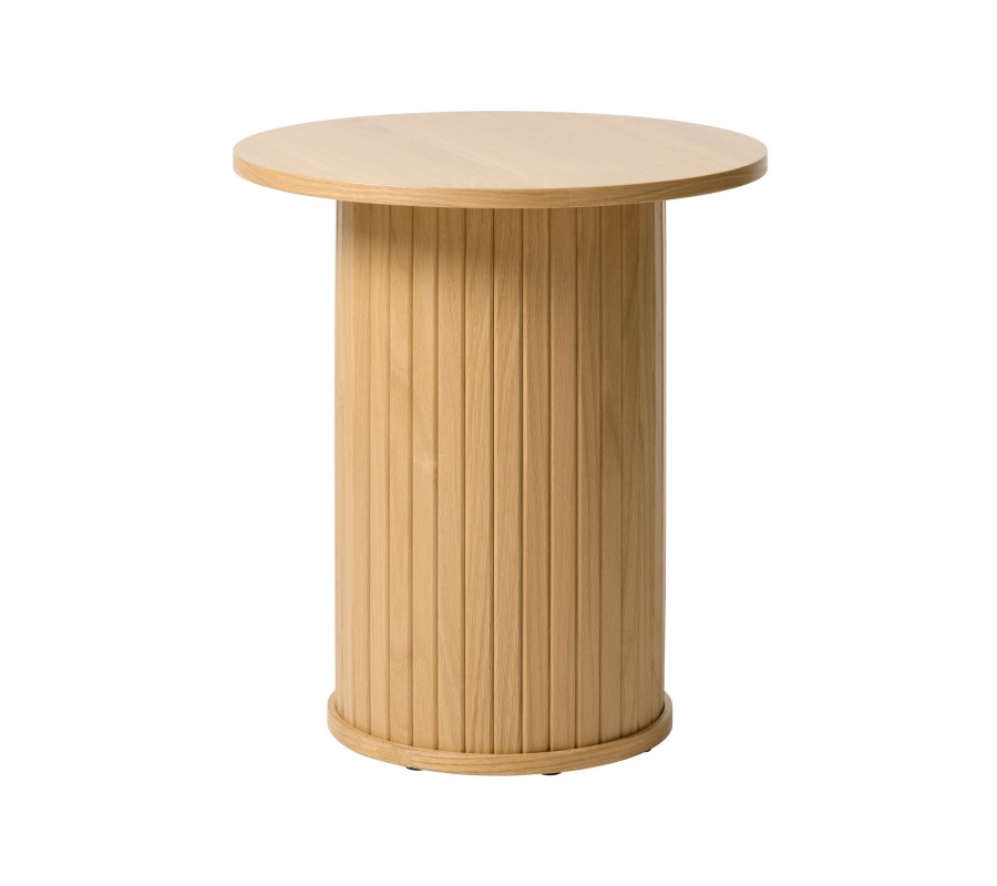 Stolík je vyrobený z kombinácie pravej dubovej dyhy a MDF. Prírodný svetlý hnedý odtieň dopĺňa pravidelná kresba letokruhov, ktorá mu dodáva typický škandinávsky výraz.