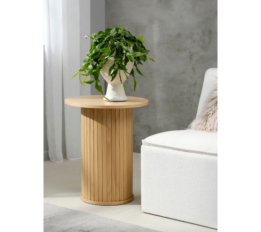 Škandinávsky okrúhly príručný stolík Bornholm s lamelovým dekorom v prírodnom svetlom hnedom dubovom prevedení 55 cm