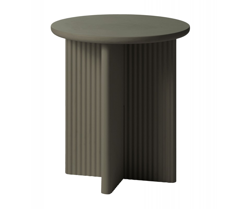 Moderný okrúhly príručný stolík Hvidea s dizajnovou rebrovanou podstavou v olivovom zelenom prevedení 50 cm