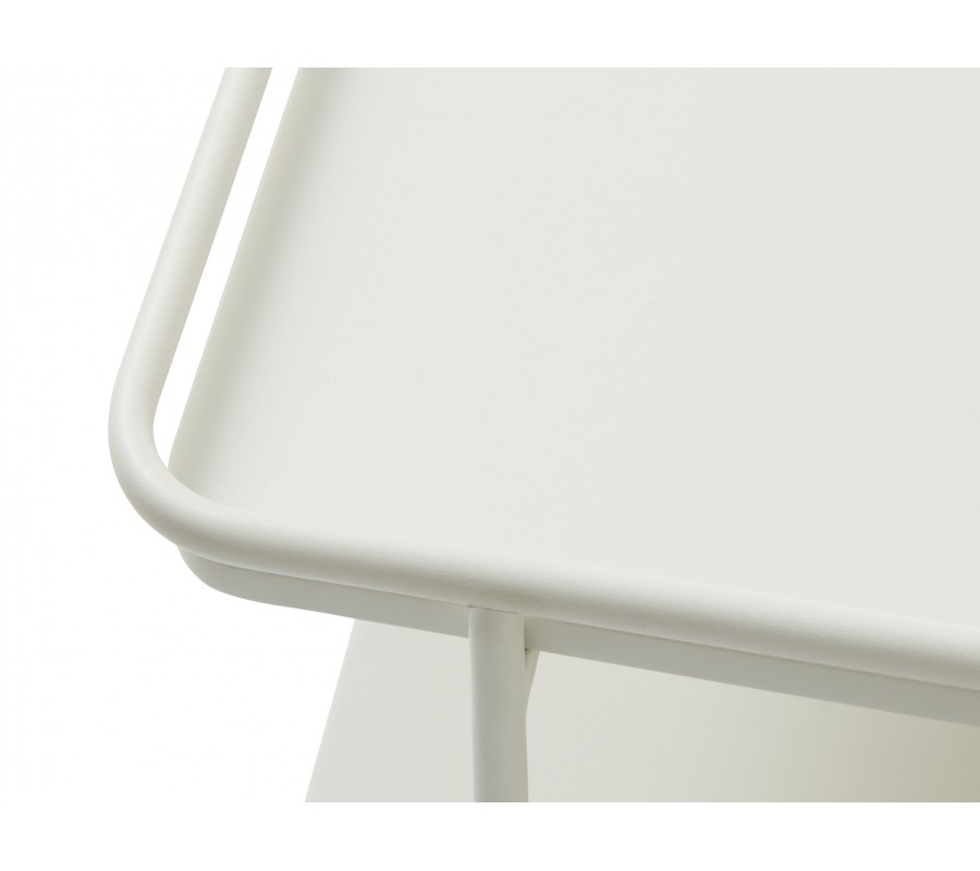 Vrchná doska má štvorcový tvar so zaoblenými rohmi a dopĺňa ju praktická otvorená polica v spodnej časti. Stabilitu zabezpečujú štyri štíhle nohy valcovitého tvaru s klzákmi, ktoré ochránia podlahu. Nohy sú upevnené z bočnej strany a mierne presahujú nad úroveň dosky, kde ich spája rám štvorcového tvaru. Ten zároveň vytvára štýlové aj praktické ohraničenie.