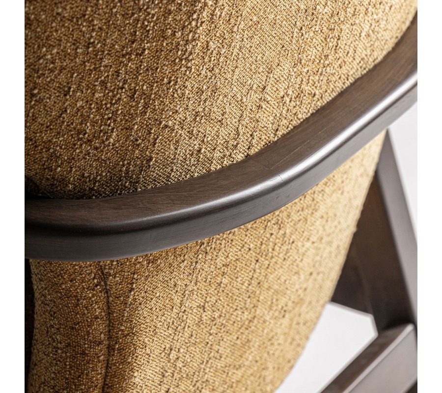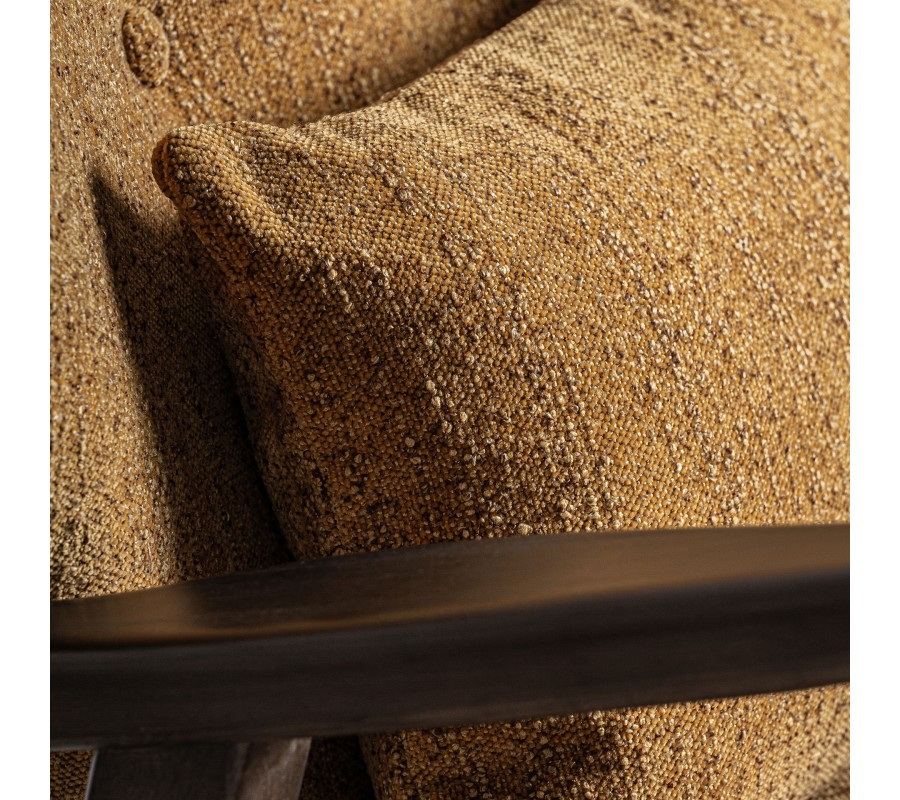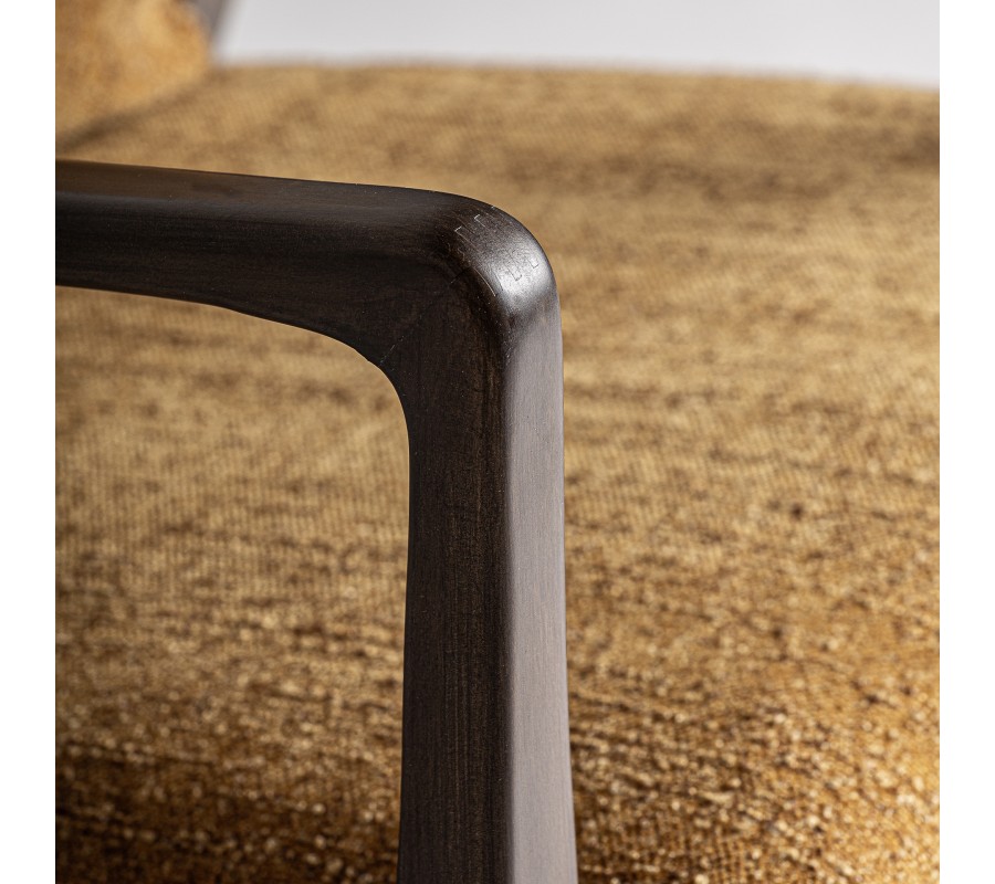 Kreslo má pevný rám vyrobený z masívneho dreva. Lakovanie v tmavej hnedej farbe zachováva prirodzenú kresbu letokruhov a pôsobí tak teplým a prírodným dojmom. Výborne ho dopĺňa poťah v okrovej žltej farbe. Má výraznú tkanú štruktúru, ktorá je príjemná na dotyk a v kombinácii s nerovnomernou farebnosťou vlákna pôsobí organickým dojmom, pripomínajúcim ľan. Textília je vyrobená z mikrovlákna, ktoré je mimoriadne odolné voči vplyvom každodenného používania a zaručí dlhodobý krásny vzhľad.