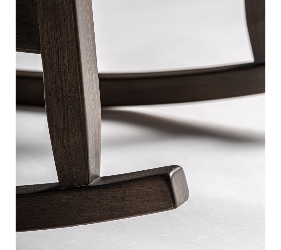 Kreslo má obdĺžnikovú sedaciu časť, vystlanú sedacím vankúšom. V zadnej strane sa na neho napája tvarovaná chrbtová opierka s rozšírenou vrchnou časťou. Z vnútornej strany ju zdobí minimalistické prešívanie s okrúhlymi gombíkmi a praktickým doplnkom je aj menší štvorcový vankúš na podopretie chrbtice. Drevené opierky na ruky prechádzajú na prednej strane v plynulom oblúku do nožičiek. Na zadnej strane sú prepojené zaobleným prvkom, poskytujúcim dodatočnú oporu pre chrbtovú opierku. Zadné nohy sú tiež zošikmené a prepojené s prednými hojdacou podstavou v spodnej časti. Výbornú stabilitu zabezpečujú aj výstuhy medzi nožičkami na stranách. Okrem toho dodávajú kreslu estetický prvok inšpirovaný vidieckym štýlom. Tento charakter podčiarkujú aj jemné zaoblenia a zvlnené línie opierok.