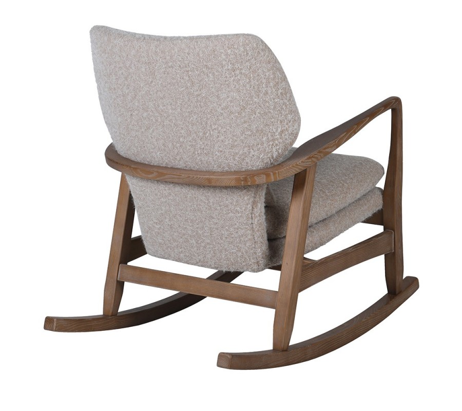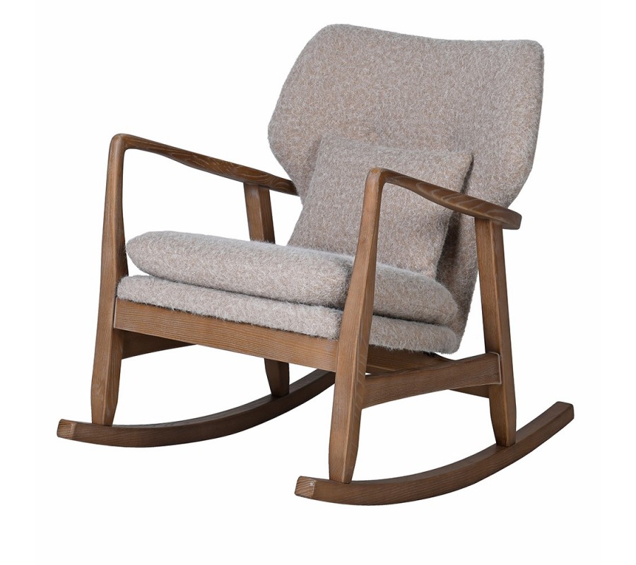 Retro hojdacie kreslo Armonia je luxusný kúsok, ktorý spája pohodlie a originálny dizajn. Jeho konštrukcia z jaseňového dreva v hnedej farbe s výraznou štruktúrou letokruhov pôsobí prirodzene a stabilne. Hranaté bočné opierky dodávajú kreslu pevnú formu a nadčasový vzhľad.