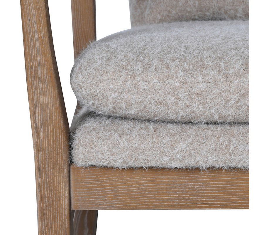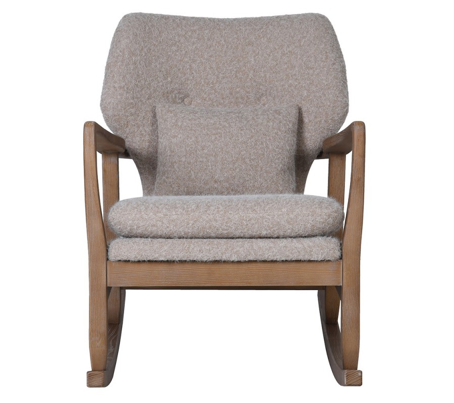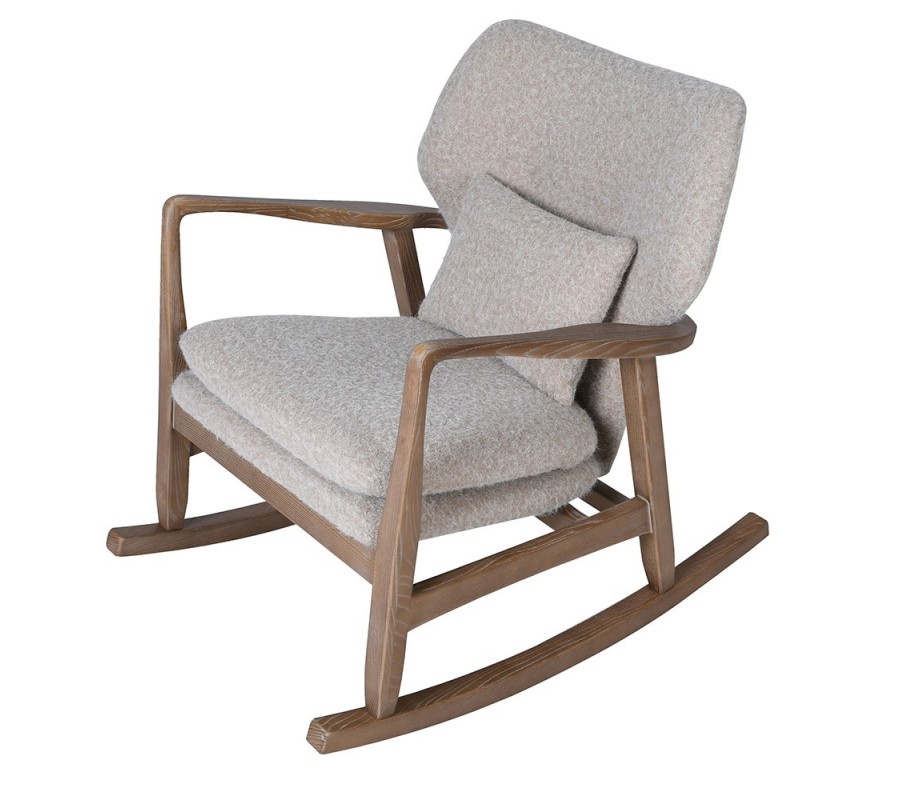 Sedadlo aj chrbtové operadlo sú potiahnúté sivou látkou s plsteným efektom, ktorý pôsobí útulne a elegantne. Pohodlie zvyšujú dva vankúše – štvorcový na sedenie a menší obdĺžnikový pre podporu chrbta. Spodné ohnuté tyče zabezpečujú jemný a plynulý hojdací pohyb.
