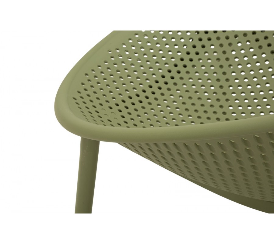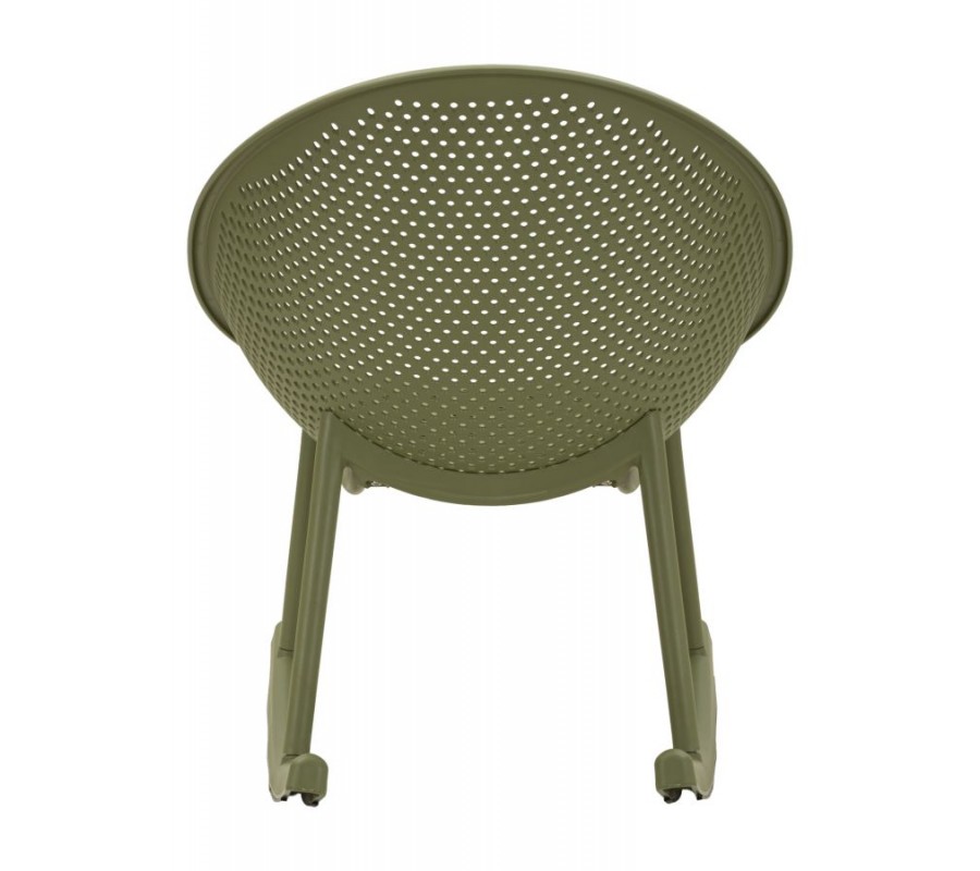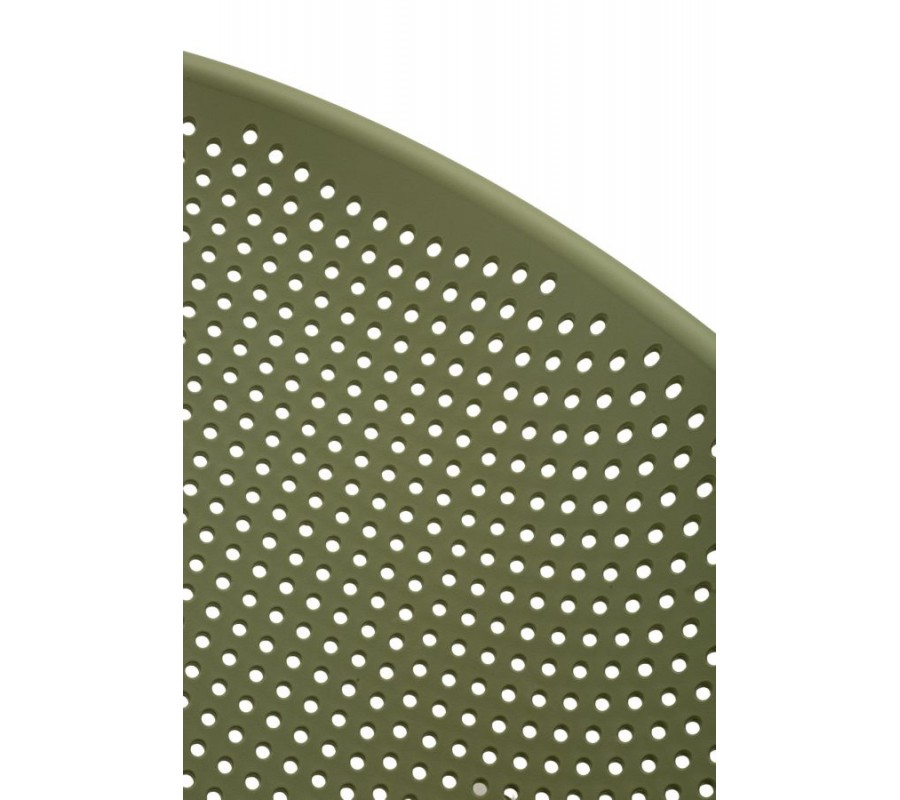 Kreslo je vyrobené z odolného plastu, ktorý zaručuje nízku hmotnosť a jednoduchú údržbu. Sýta zelená farba pôsobí výrazne a sviežo. Zaujímavým detailom je aj perforácia sedacej časti pravidelnými kruhovými otvormi, ktoré vytvárajú dekoratívnu štruktúru a dodávajú kreslu vzdušný vzhľad.