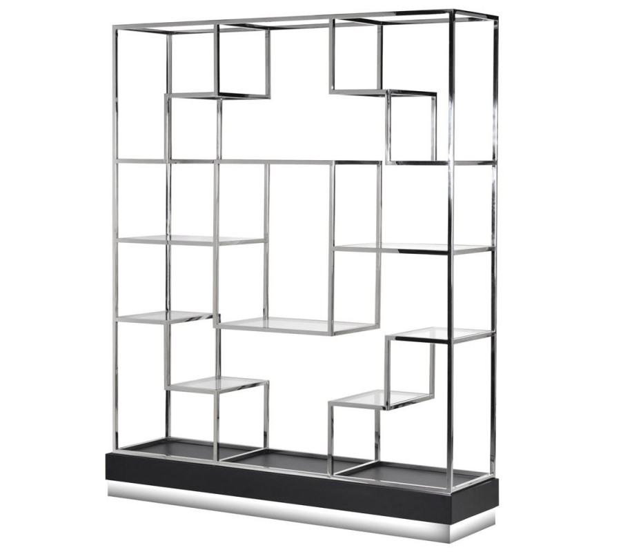 Luxusná chrómová knižnica Calera s geometrickou konštrukciou a sklenenými poličkami 221,5cm