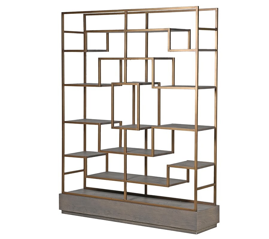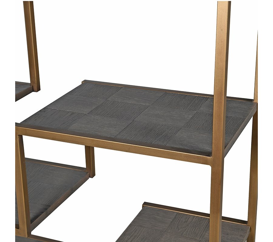 Exkluzívna knižnica z kolekcie Walena v modernistickom retro štýle jezároveň využiteľná ako praktický a štýlový regál. Neuveriteľne štýlová kombinácia minimalistických sivých tónov masívneho dubového dreva v mozaike, ktorá kladie dôraz na jeho prirodzenú kresbu a elegantného lesku mosadzných nosných prvkov, do ktorých je drevo zasadené pôsobí veľmi jedinečne a nadčasovo. Množstvo políc dáva naozaj široké možnosti Vašej fantázii a môžete vďaka nim vytvárať najrôzenjšie štýlové kompozície. Pre skutočne dizajnérsky vzhľad kombinujte knižnicu Walena najmä so zemitými farbami a výraznými doplnkami s minimalistickou kontrastnou farebnosťou.