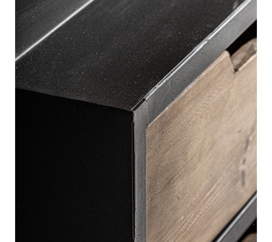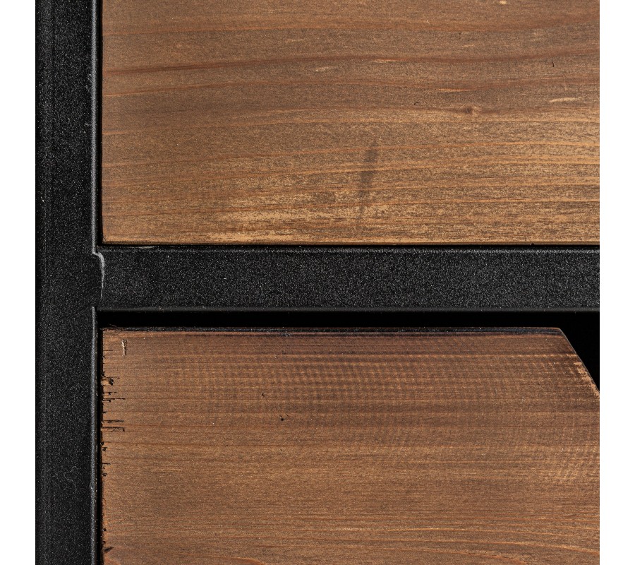 V spodnej časti sa nachádza uzavretý úložný priestor, ktorý svojou hĺbkou mierne presahuje hĺbku políc. Je vyrobený z čierneho kovu a predelený na tri rovnaké vertikálne sekcie. V dvoch bočných sú nad sebou umiestnené po dve drevené zásuvky a stredová časť je predelená jednou policou. Úchytky na zásuvkách majú podobu lichobežníkového výrezu vo vrchnej časti a pôsobia tak funkčným a minimalistickým dojmom.