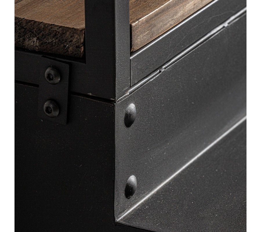 Knižnica bude vďaka svojej výške 245 cm jedným z dominantných prvkov miestnosti. Jej konštrukcia je vyrobená z kovu v čiernej farbe, ktorý jej dodáva výrazne priemyselný vizuál, podporený aj veľkými okrúhlymi nitmi v spodnej časti. Kov dopĺňa recyklované masívne drevo, ktoré je ekologické a zároveň prináša do dizajnu autentický vintage prvok. Jeho svetlá hnedá farba s výraznou štruktúrou skvele korešponduje s industriálnou estetikou.