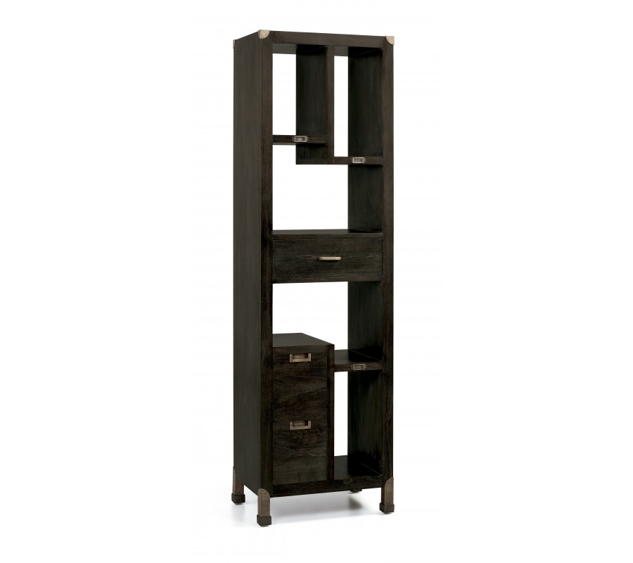 Štýlová dizajnová knižnica s tromi zásuvkami z kolekcie M-INDUSTRIAL je vyrobená z masívneho koloniálneho dreva MINDI. Kovové prvky, nožičky a rukoväte na zásuvkách tomtuo kúsku dodávajú zaujímavý industriálny nádych. DIsponuje viacerými dizajnovými poličkami a zásuvkami, ktoré sú nepravidelne rozložené a pôsobia veľmi štýlovo a originálne. Čierna farba je univerzálna a hodí sa naozaj kamkoľvek. Je taktiež ľahko kombinovateľná so širokou škálou farieb. Krásne vynikne napríklad po doladení zlatými doplnkami. Taktiež odporúčame kombinovať s ďalšími produktami z našej kolekcie M-INDUSTRIAL.
