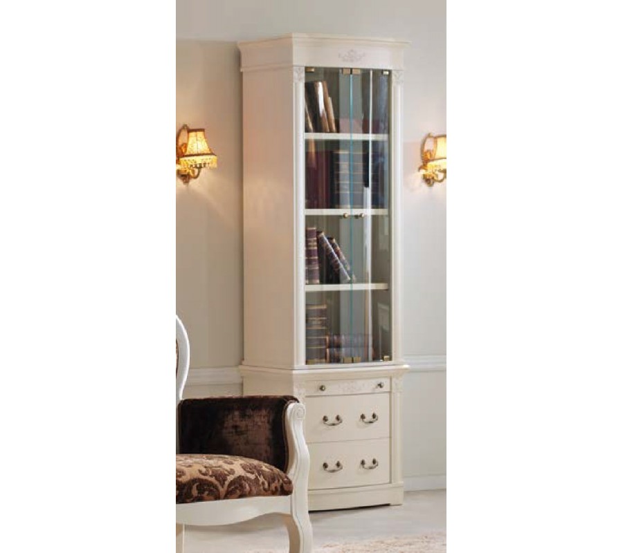 Marketériou zdobené ornamenty, detailne prepracované línie robia túto knižnicu CASTILLA exkluzívnou. Nádych baroku tejto knižnici dodávajú kovové rúčky, vysoko kvalitný bukový masív a dekoratívna rezba. Dostatok úložného priestoru na vaše obľúbené knihy alebo dekorácie zabezpečujú 4 priestranné police ako aj zásuvky v spodnej časti knižnice. Sklo poslúži ako veľmi dobrá ochrana proti prachu, čo určite oceníte nielen vy ale aj vaše knihy. Či už sa rozhodnete umiestniť túto knižnicu do pracovne alebo obývačky všade bude obohacovať priestor o svoju eleganciu, krásu a nadčasovosť. Produkt na fotografií je vo farebnom prevedení orech.