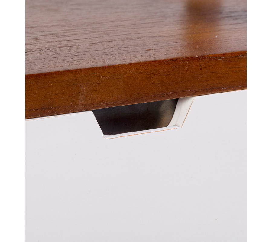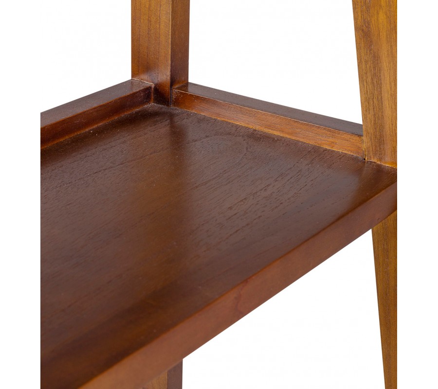 Tvar nábytku je lineárny, so zošikmenými prednými líniami. Tento obľúbený rebríkový dizajn je minimalistický, no zaujímavý svojím netradičným vizuálom. Spodná časť je umiestnená na podstave so zošikmenými nožičkami a obsahuje dve vedľa seba umiestnené zásuvky. Na ich vrchnej časti a dvoch ďalších policiach sa nachádza otvorený úložný priestor s praktickými vyvýšenými okrajmi.