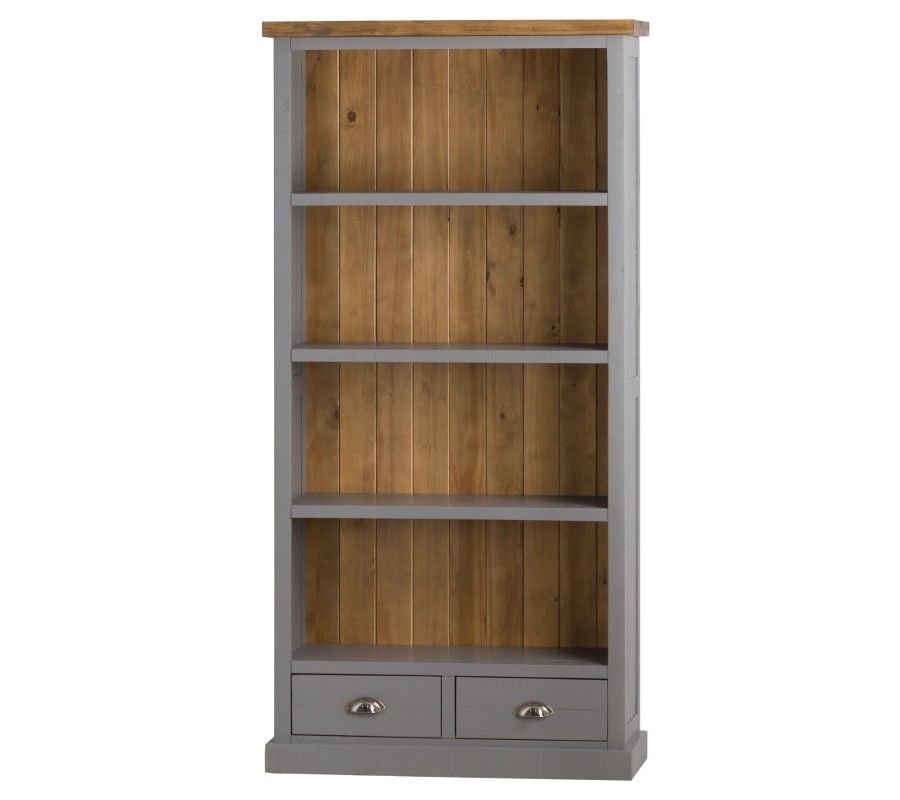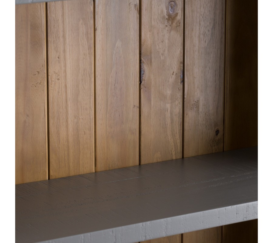 Vkusná knižnica Byland v sebe šikovne prepája prvky vidieckeho a industriálneho štýlu v rámci interiérového dizajnu. Kombinácia jemnej sivej s tmavou farbou masívnej borovicovej dosky pôsobí naozaj nadčasovo. Štyri police a dve zásuvky Vám poskytujú naozaj množstvo úložného priestoru.