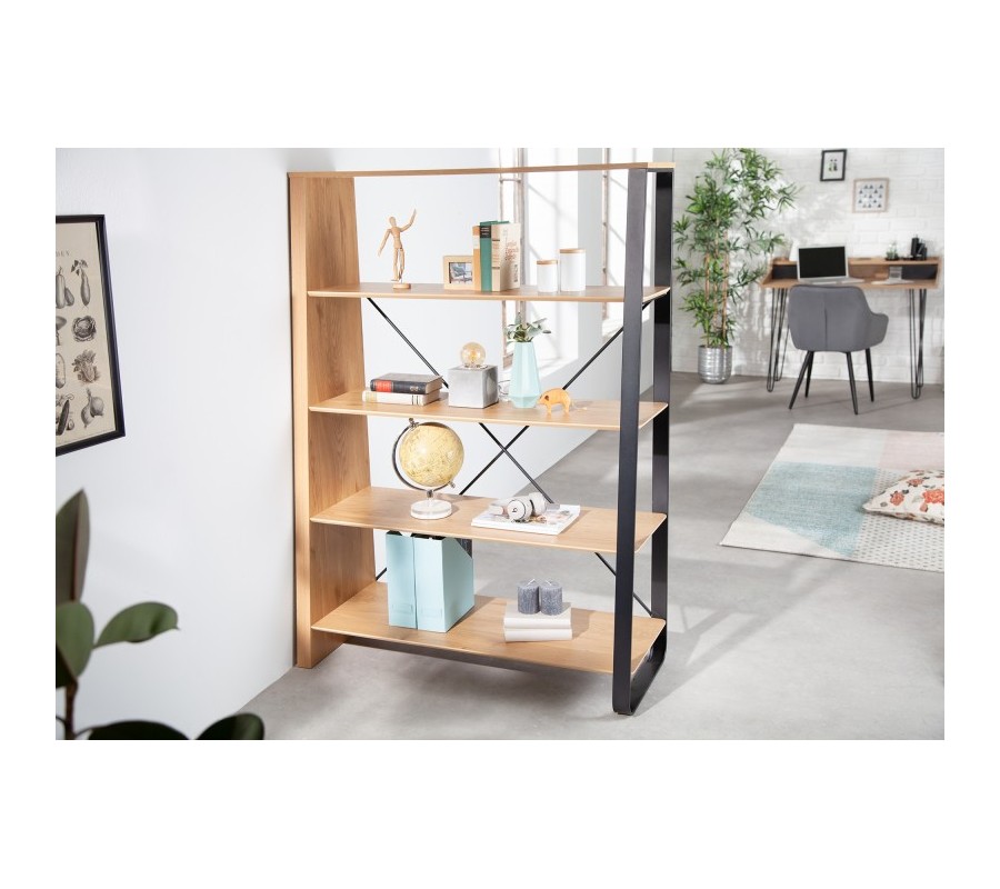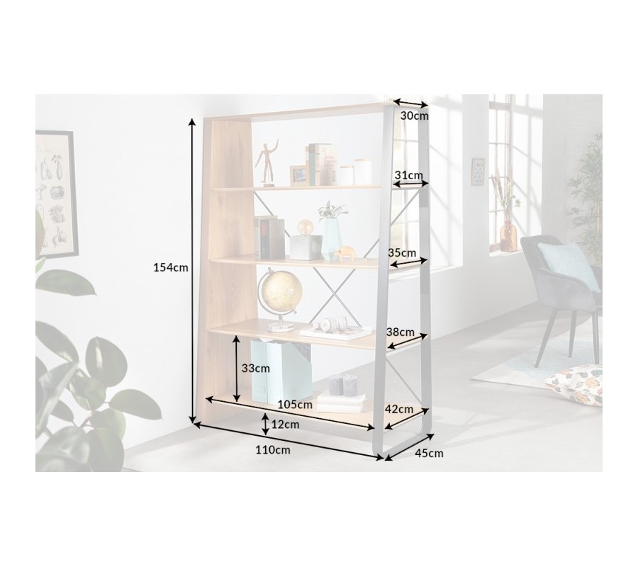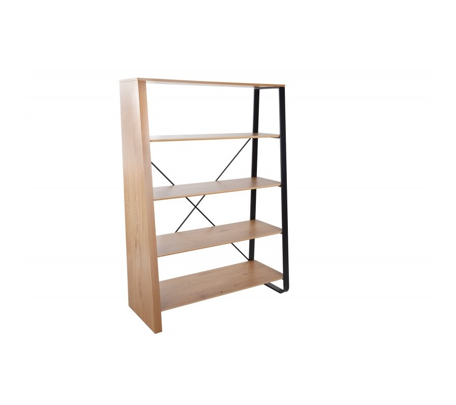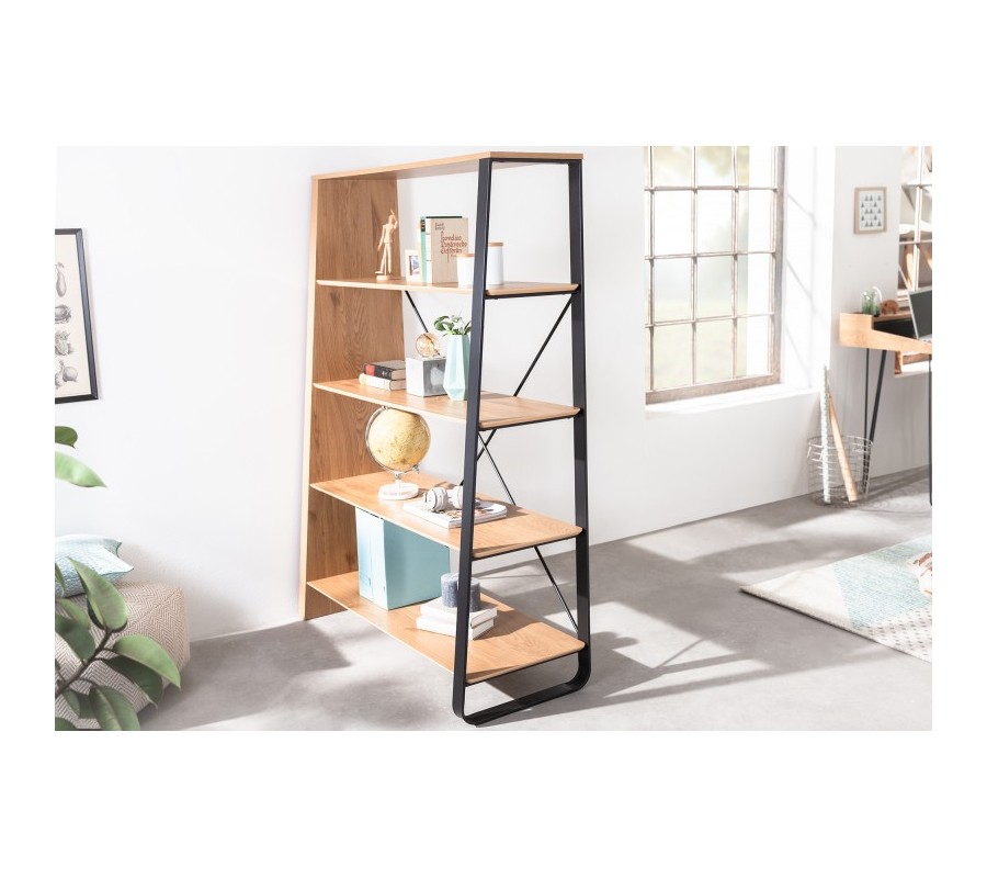 V siluete nábytku dominujú jednoduché rovné línie, oživené asymetrickým dizajnom. Regál vám poskytuje bohatý úložný priestor na štyroch policiach, ktorých hĺbka sa smerom hore zužuje. Tento rebríkový tvar zdôrazňujú aj bočné strany regálu, z ktorých je jedna solídna drevená a druhá má podobu kovového rámu. Na zadnej strane sa tiež nachádzajú dve prekrížené spojnice, zaručujúce výbornú stabilitu nábytku.