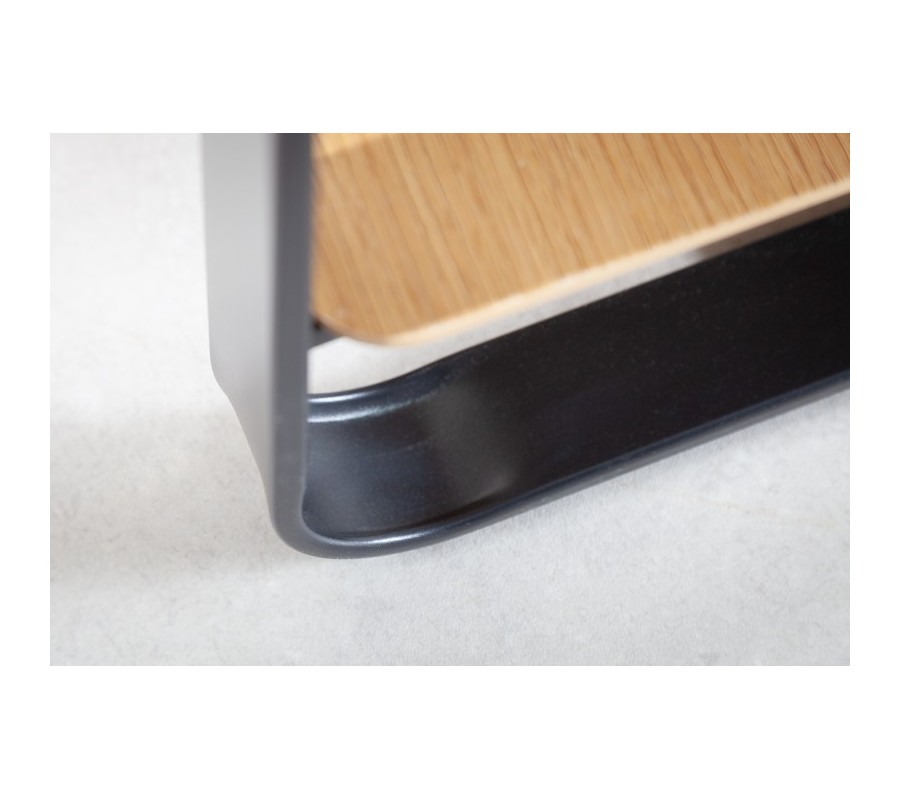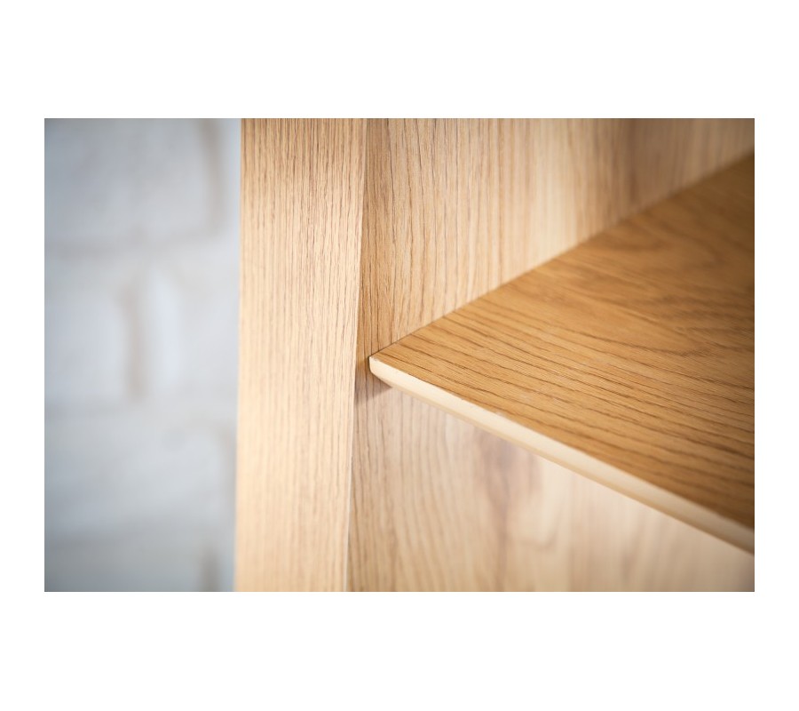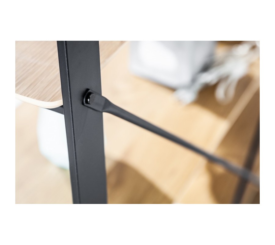 Police a drevená bočná stena sú zhotovené z pravej dubovej MDF dyhy s charakteristickou svetlou hnedou farbou dreva. Tento prírodný odtieň je obľúbenou voľbou do priestorov zariadených v škandinávskom štýle. Kovové časti majú matnú čiernu farbu a pôsobia industriálnym dojmom.