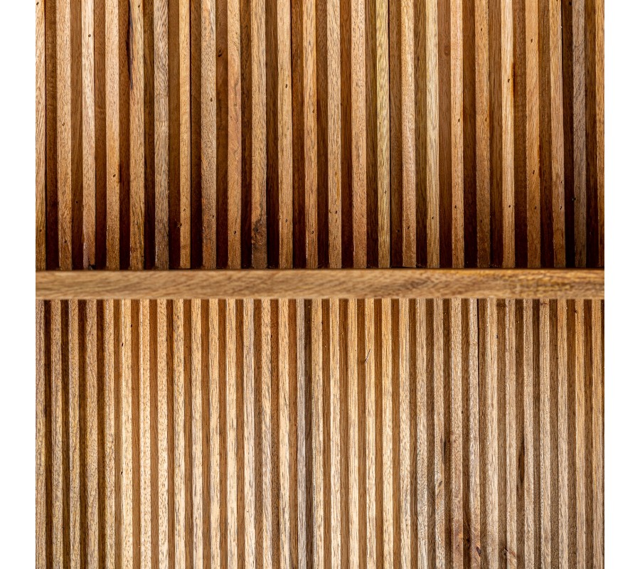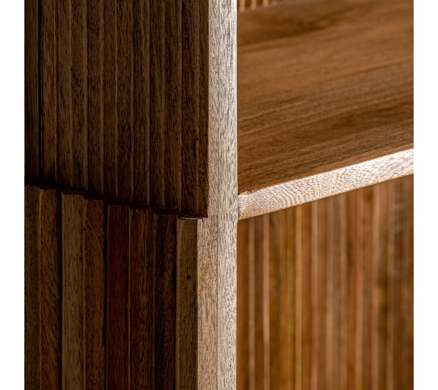 Exkluzívna knižnica z kolekcie Plissé Nature vás uchváti svojím kvalitným prevedením a dizajnovými prvkami. Knižnica disponuje kvalitným mangovým masívom, ktorý je ozdobený vertikálnymi líniami. Drevo je chránené dyhou a zároveň povrchová úprava vyzdvihuje prirodzený drevený vzhľad a hnedú farbu, ktorá vytvára jemný nádych vidieckeho štýlu pri knižnici Plissé Nature. Knižnica disponuje štyrmi poličkami, ktoré ponúknu dostatok priestoru pre vystavenie vašich obľúbených kníh alebo dekorácií. Pri poličkách je z vonkajšej strany vyrezávanie upravené tak, aby vytváralo vzhľad štyroch separátnych dosiek, čomu pomáha aj spomenuté vertikálne vyrezávanie, pretože pri každej poličke je hrúbka vyrezávania rozdielna, vďaka čomu naberá unikátny vzhľad. Vďaka svojmu prírodnému vzhľadu sa knižnica môže kombinovať v tmavých art-deco interiéroch s nábytkom z kolekcie Plissé Nature, poprípade vynikne aj v interiéroch s nádychom vidieckeho štýlu.