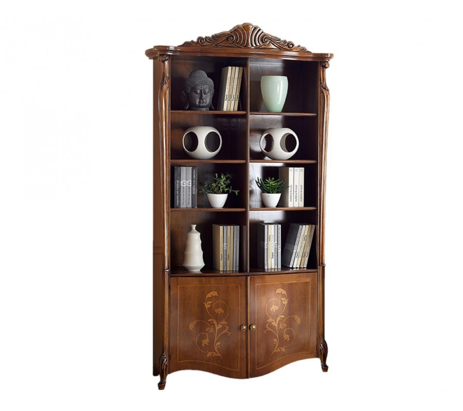 Unikátna knižnica Pasiones vyrobená z masívneho dreva predstavuje prepojenie elegancie a kvality. Už na prvý pohľad zaujme svojím bohatým zdobením v podobe ručného vyrezávania a ornamentálnej korunky na vrchu. Pre jednoduchší klasickejší vzhľad je možné zvoliť si aj variant bez korunky. Úložný priestor v podobe ôsmich otvorených poličiek je vhodný na vystavenie všetkých vašich knižných pokladov a dekorácií. Ostatné predmety možno uložiť do poličiek s dvomi dvierkami v spodnej časti. Dvierka zdobí nádherná intarzia a precízne ručné vyrezávanie. Zaoblené vyrezávané nožičky typické pre štýl chippendale dotvárajú celkový starožitný vzhľad. Knižnica Pasiones zapadne predovšetkým do rustikálne, klasicky či koloniálne ladených obývačiek. Odporúčame ju tiež kombinovať s čalúnenou sedačkou či kreslom a doplniť o výrazné dekorácie.