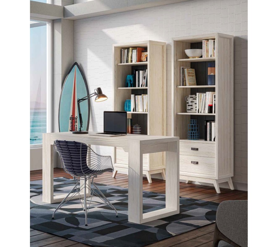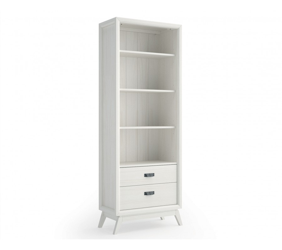 Knižnica má vysokú štíhlu siluetu, v ktorej dominujú moderné rovné línie. Zadná a bočné strany sú plné, s minimalistickým kazetovým dizajnom s vyzdvihnutým rámom, zdôrazňujúcim geometrickosť tvarov. V spodnej časti sú umiestnené dve zásuvky, pričom vrchná je nižšia, a poskytujú uzatvárateľný úložný priestor na dokumenty či osobné predmety, ktoré chcete mať bezpečne uložené. Úchytky sú vyrobené z kovu a majú minimalistický obdĺžnikový tvar. Nad zásuvkami na nachádzajú štyri otvorené policové miesta, ideálne na knihy či dekorácie.