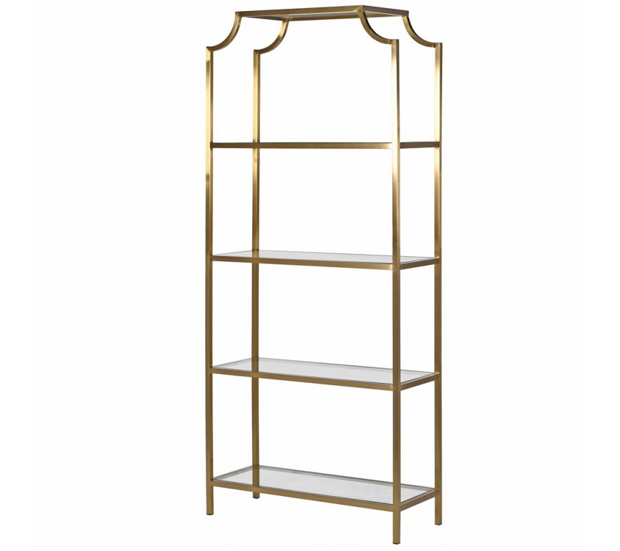 Art deco vysoký regál Anquell zkatej farby so štyrmi sklenenými policami a telom z ocele do obývačky či pracovne 210cm