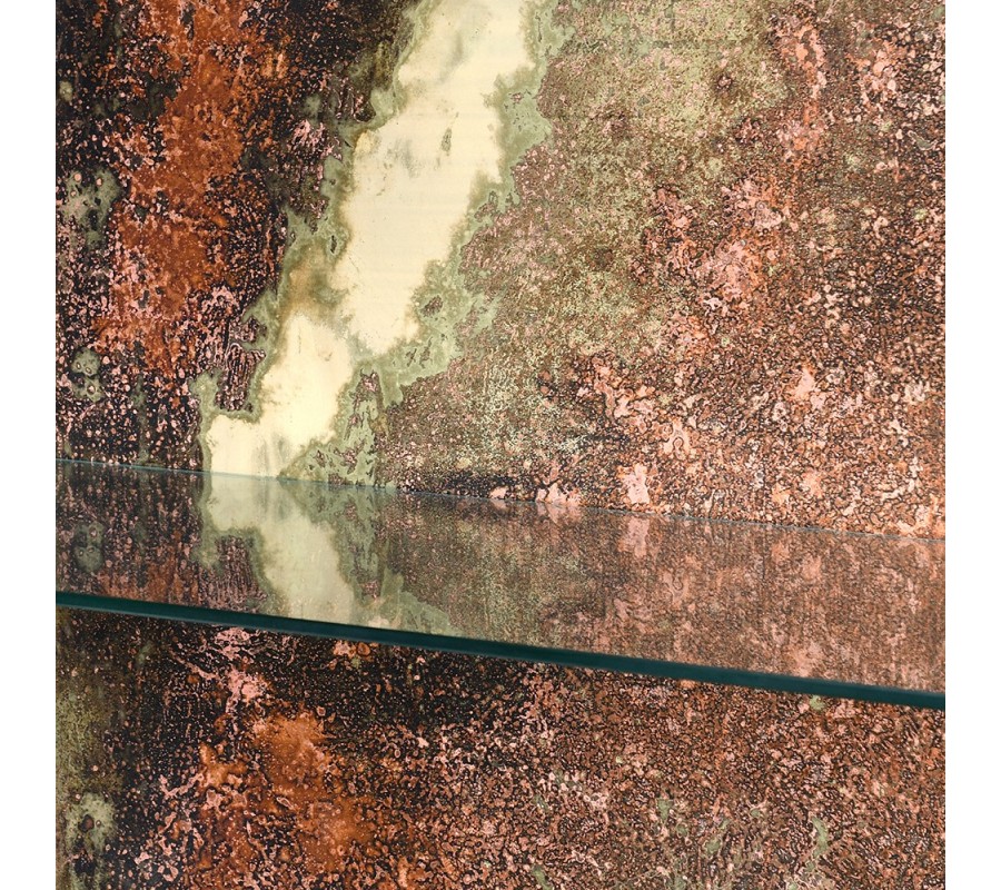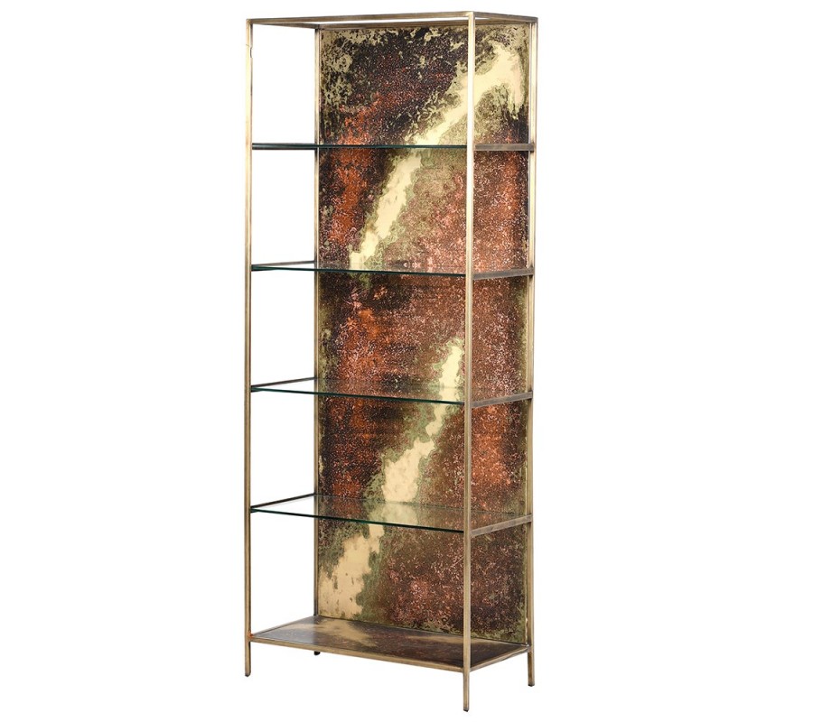 Štýlový regál z našej luxusnej kolekcie Oxidia zaujme už na prvý pohľad. Jeho dizajn je špecifický najmä vďaka jedinečnému efektu oxidácie, ktorý zdobí zadnú stenu vytvárajúcu abstraktné obrazce v hnedých odtieňoch. Konštrukcia regálu je vyrobená z kovu a svojou lesklou zlatou farebnosťou rozžiari priestory vašej obývačky, spálne či pracovne. Regál poskytuje úložný priestor v podobe piatich sklenených poličiek, ktoré mu dodávajú nádych elegancie a noblesy. Jednoduché minimalistické tvary v kombinácii s kvalitnými materiálmi a originálnym dizajnom tvoria jedinečný a dominantný kúsok vhodný najmä do art deco a moderne ladených interiérov. Pre vytvorenie dokonalého elegantného súladu odporúčame tiež ďalšie kúsky z kolekcie Oxidia, prípadne iné doplnky z kovu v zlatom odtieni, čalúnené kreslo či sedačku a zrkadlové prvky.