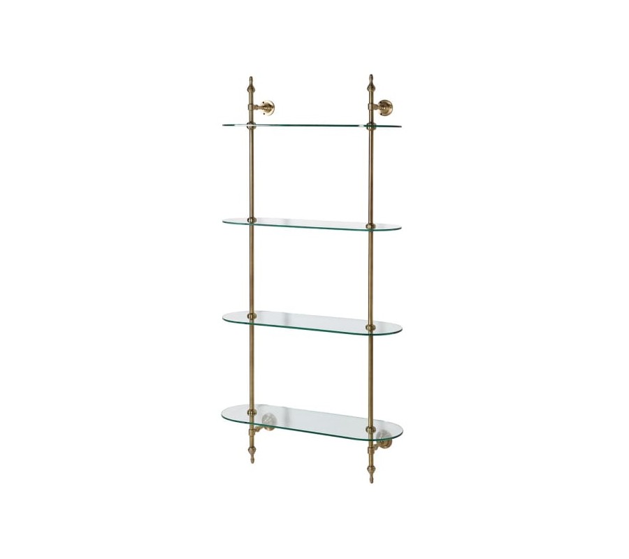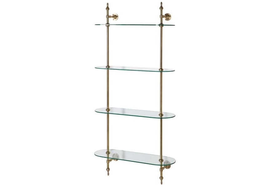 Art-deco nástenný regál Empiria s medenou kovovou konštrukciou a so štyrmi sklenenými poličkami 165cm