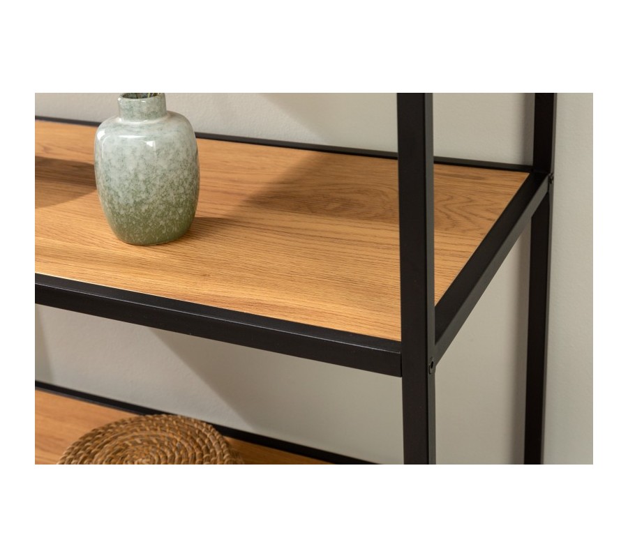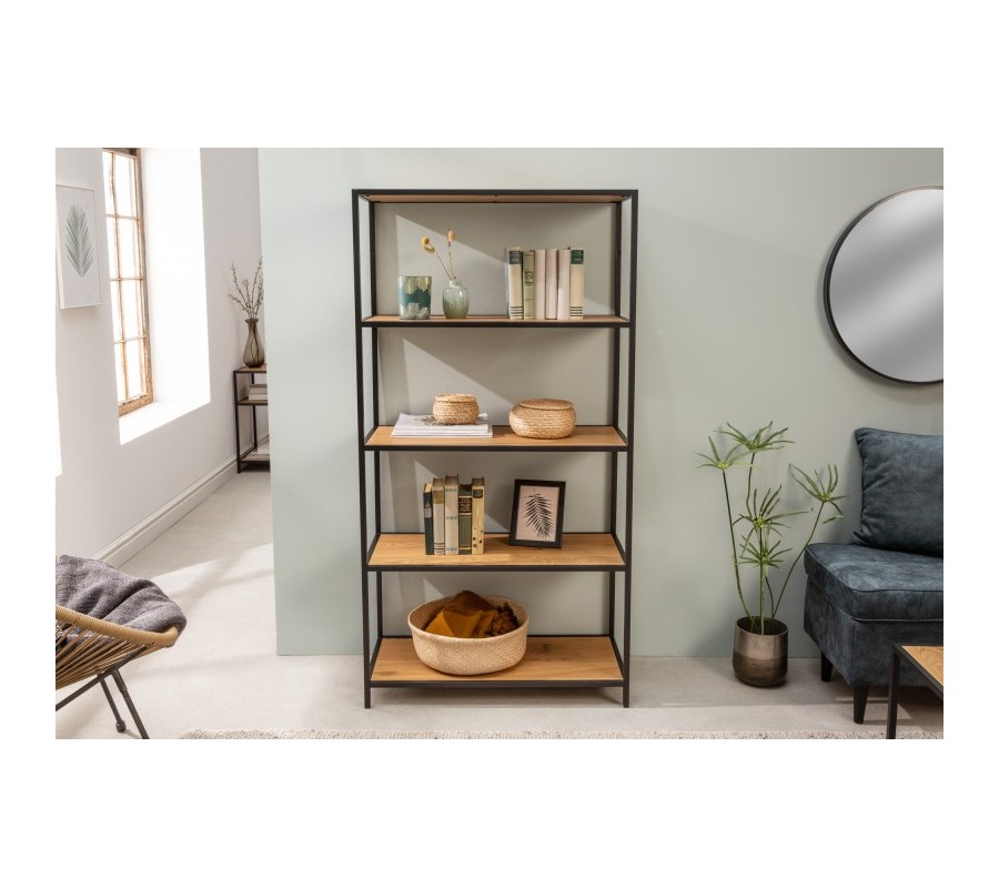 Moderný regál z kolekcie nábytku Industria Natura Vám svojím minimalistickým vzhľadom krásne dotvorí Váš industriálne zariadený interiér. Industriálny vzhľad regálu Industria Natura je dosiahnutý vďaka kovovej konštrukcií s čiernym práškovým náterom, čo vyzdvihne drsnejší industriálny vzhľad. Na vystavenie Vašich obľúbených dekorácií, kníh, cenností alebo iných vecí Vám regál Industria Natura ponúkne priestor v podobe štyroch 77 centimetrov dlhých políc s výškou 34 centimetrov medzi policami, čo umožní vystavenie aj vyšších dekorácií. Police regálu Industria Natura sú vyrobené z kvalitne dyhovaného dreva vo svetlo hnedom dubovom prevedení, čo zvírazní štruktúru a línie dreva. Regál Industria Natura odporúčame kombinovať s kovovým nábytkom z kolekcií Industria Natura, Negra a Durante, s tmavo čalúnenými sedačkami a taktiež s kovovými doplnkami, zrkadlami a lampami.
