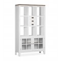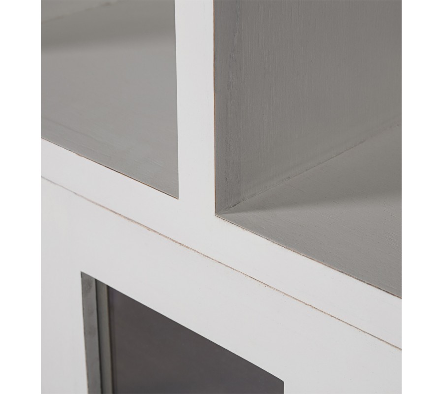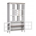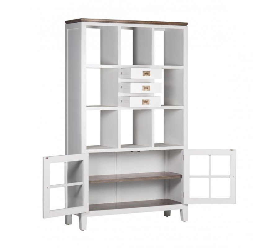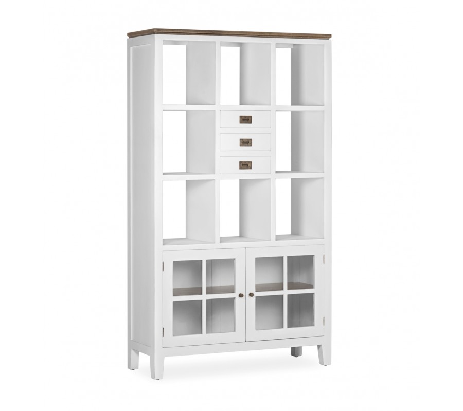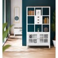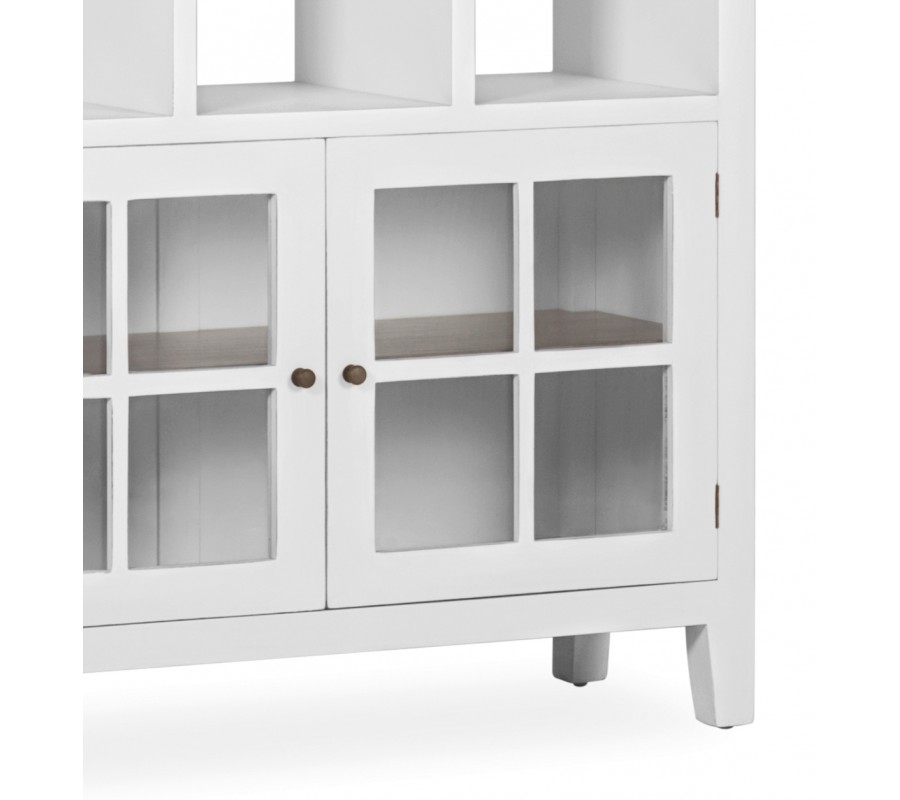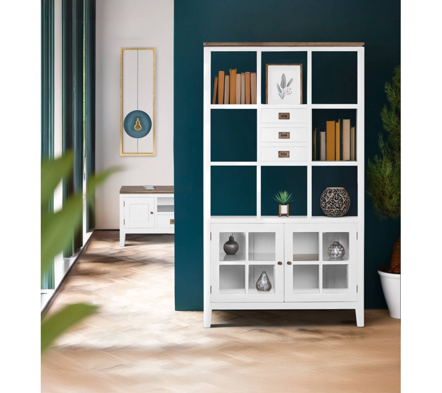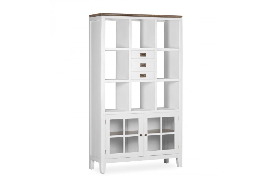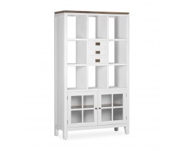 Luxusná masívna knižnica Blanc z dreva mindi v bielom prevedení s poličkami, zásuvkami a sklenenými dvierkami 190cm