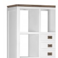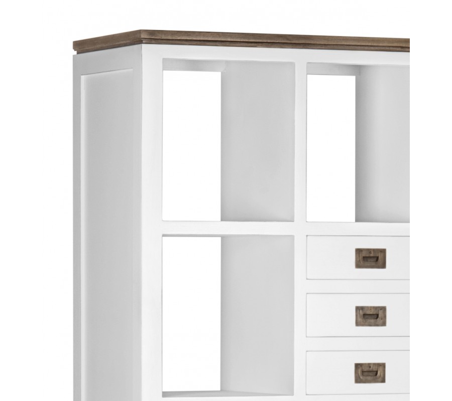 Luxusná knižnica z našej kolekcie Blanc vo svojom dizajne prepája prvky klasického, koloniálneho a moderného štýlu. Je vyrobená z kvalitného masívneho dreva mindi, ktoré je charakteristické svojou odolnosťou a vášmu nábytku zabezpečí dlhú životnosť. Hladká povrchová úprava v bielom prevedení pôsobí elegantným dojmom a zapadne aj do modernejšie ladených priestorov. Priestranná knižnica ponúka bohatý úložný priestor pre všetky vaše knižné poklady. Disponuje ôsmimi otvorenými poličkami, tromi menšími zásuvkami a praktickými poličkami so sklenenými dvierkami, ktoré nechajú vaše knihy vyniknúť a zároveň ich ochránia pred prachom. Poličky tiež možno využiť na vystavenie dekorácií či uskladnenie dokumentov pri využití v kancelárii či pracovni. Kontrastným prvkom k bielemu telu je vrchná doska v prírodnej hnedej farbe, ku ktorej ladia aj kovové úchyty na dvierkach a poličkách. Knižnica Blanc si svoje miesto nájde v luxusných priestoroch obývačiek, pracovní či spální a dá sa naozaj všestranne využiť. Svojím elegantným nadčasovým dizajnom spríjemní vaše priestory a zároveň prakticky poslúži. Dokonalú kombináciu vytvorí s ďalšími kúskami z našej rovnomennej kolekcie, prípadne iným masívnym nábytkom a čalúnenou sedačkou či kreslom v koloniálnom štýle.