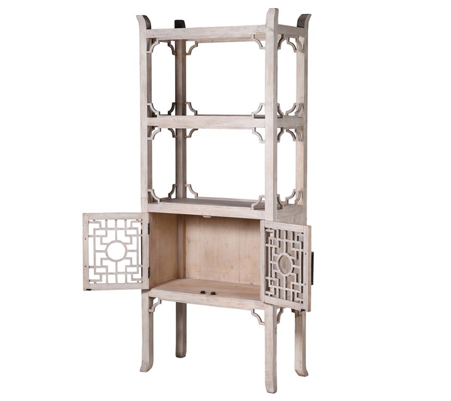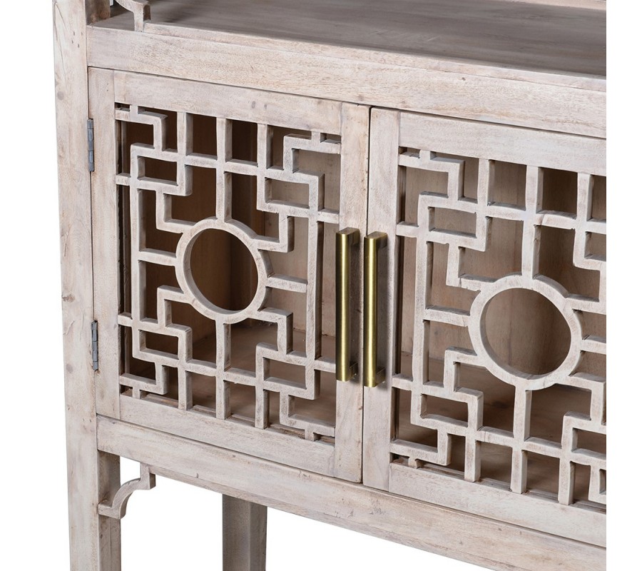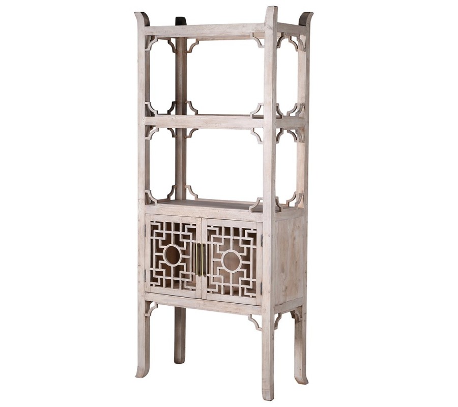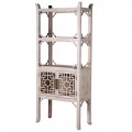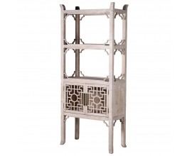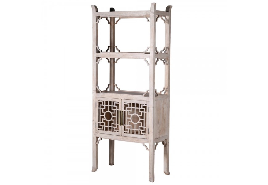 Rustikálny vintage regál Nature a poličkami a vyrezávanými dvierkami z masívneho dreva svetlohnedej farby 210cm