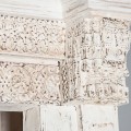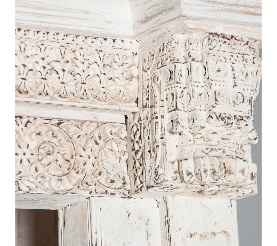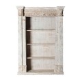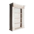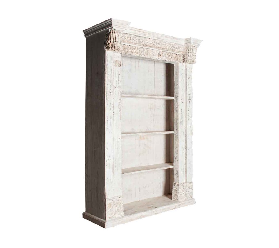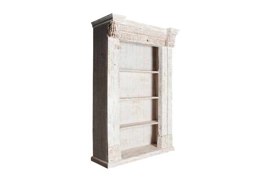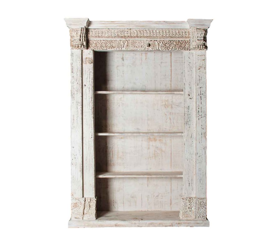 Etno knižnica Maleesa z masívneho dreva so štyrmi poličkami bielej farby s patinou a s vyrezávaným zdobením 232cm
