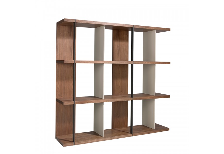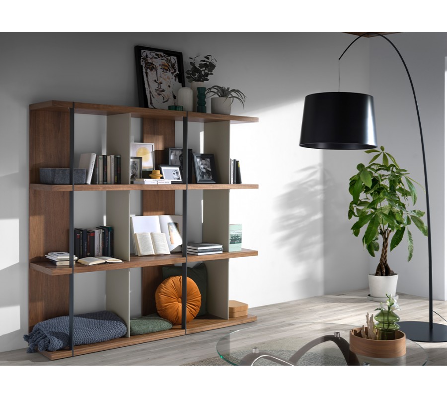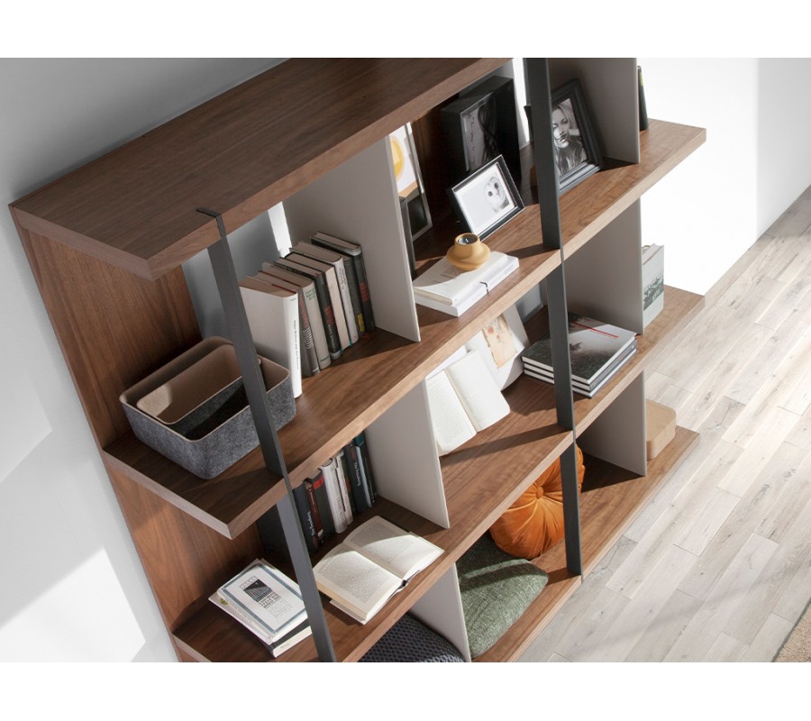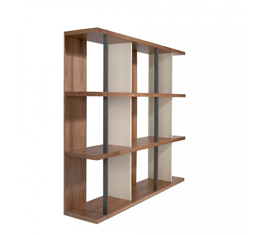 Luxusná knižnica Vita Naturale disponuje konštrukciou a drevenými policami, obohatenými o kvalitné orechové dyhovanie v prírodne hnedej farbe. Drevené prevedenie doplnia vertikálne dosky so sivým až krémovo bielym matným povrchom a oceľová konštrukcia v čiernom epoxidovom prevedení, vďaka čomu vznikne jemný nádych industriálneho štýlu.