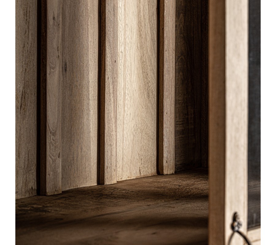 Luxusná vitrína Cecil prinesie do vašej domácnosti teplý a útulný nádych vidieckeho štýlu. Je vyrobená z teakového dreva v príjemnej svetlej hnedej farbe s viditeľnou prírodnou kresbou letokruhov.