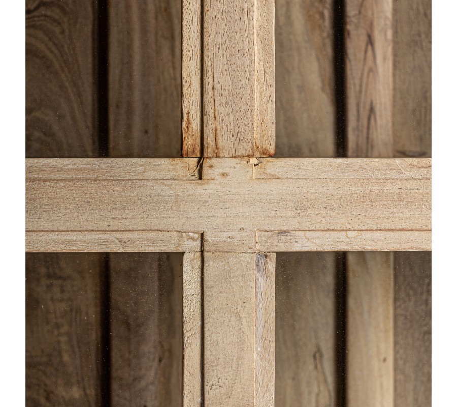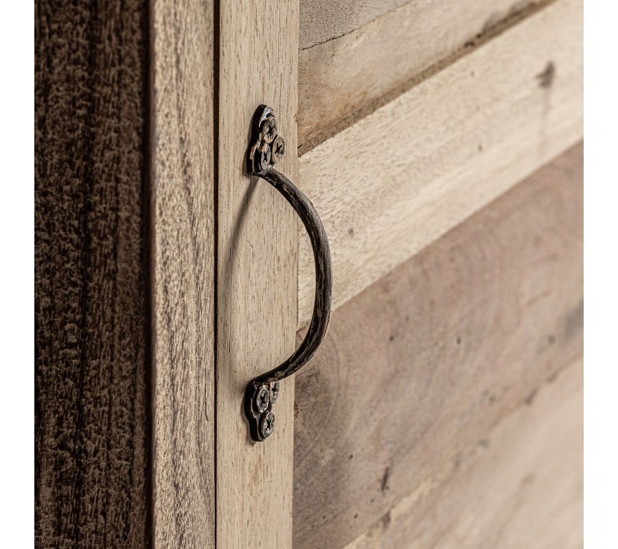 Silueta nábytku je lineárna, s čím korešpondujú aj rovné priečky v dizajne dvierok či na bočných strán. Na vrchnej časti sa nachádza prečnievajúca rímsa s vyrezávaným reliéfom, ktorá v kombinácii s masívnym drevom prináša do dizajnu esenciu vidieckeho štýlu. Ďalším šarmantným detailom sú poloblúkové kovové úchytky na otváranie dvierok so starožitne pôsobiacim zošúchaným náterom.