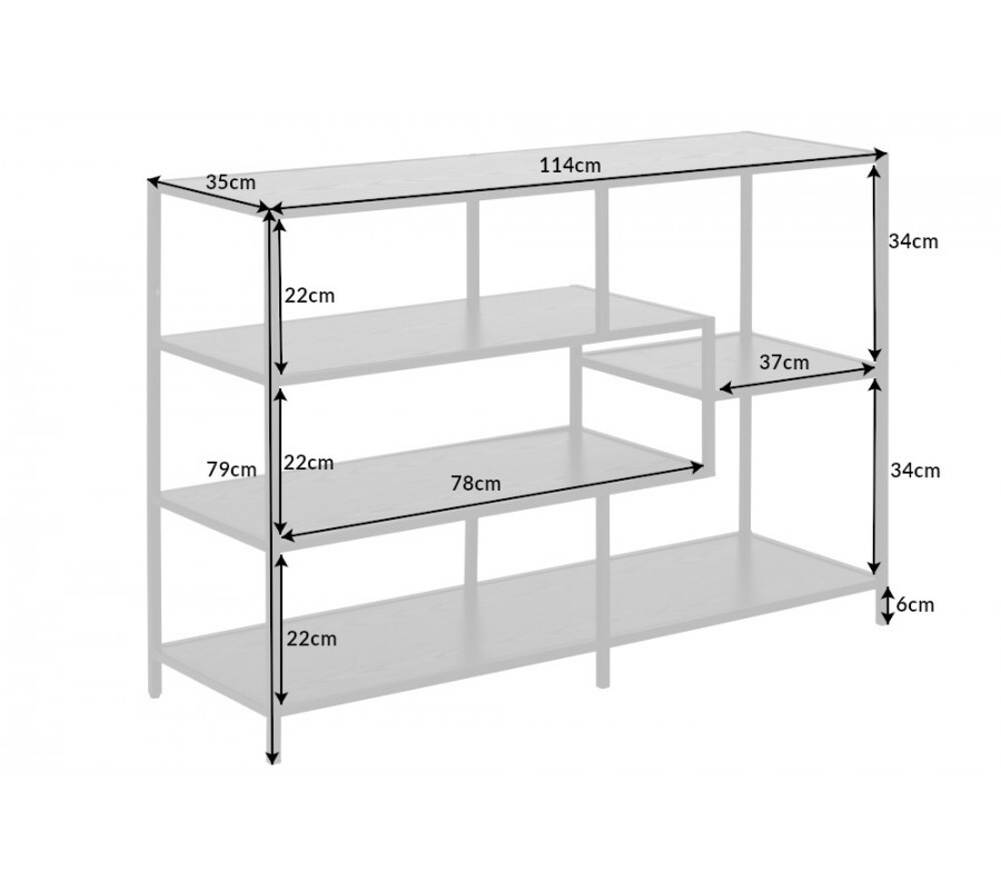 Aj napriek pevným materiálom, silueta nábytku pôsobí ľahkým a vzdušným dojmom. Poskytne vám bohatý úložný priestor na knihy, praktické predmety, či dekorácie a rastliny na štyroch policiach a vrchnej časti.