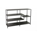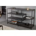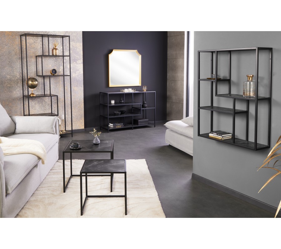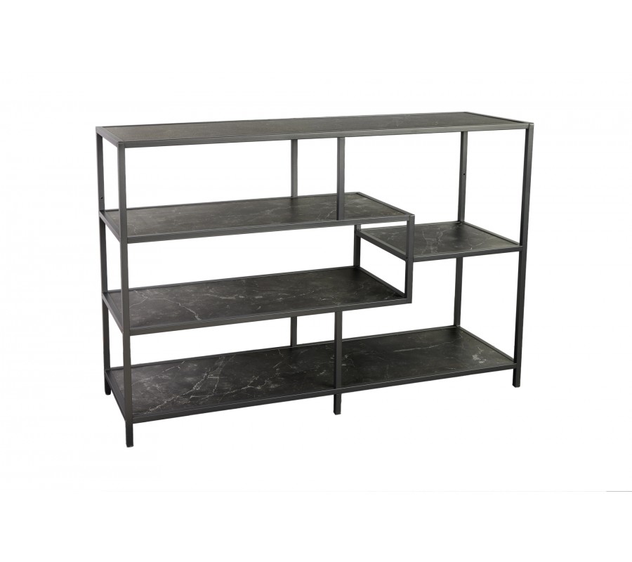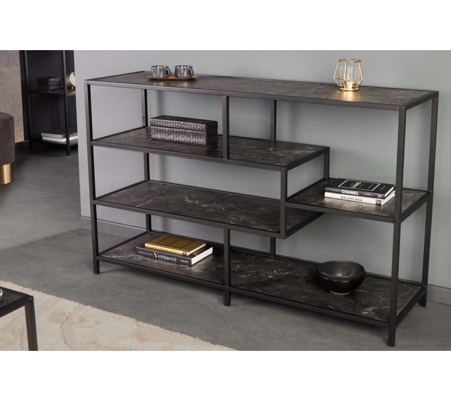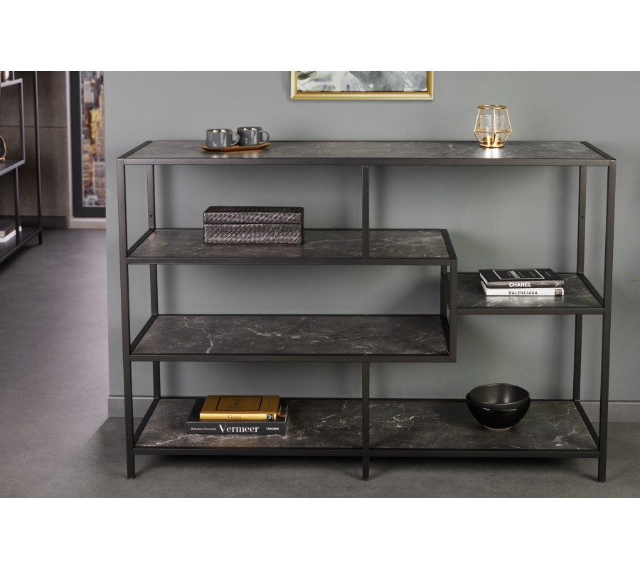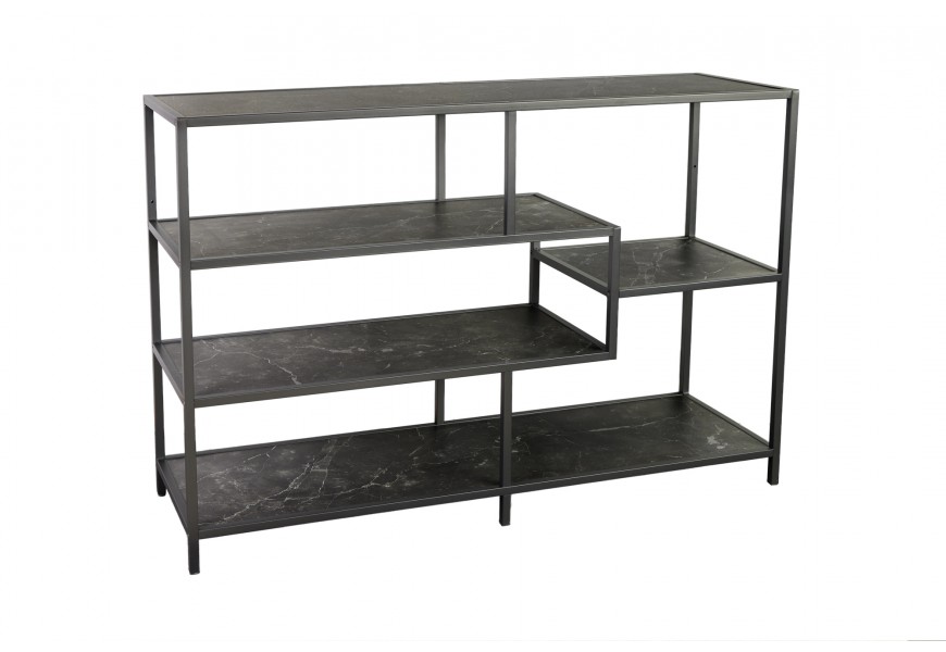 Industriálny čierny nízky regál Industria Marble s asymetrickými policami s mramorovým dizajnom 115 cm