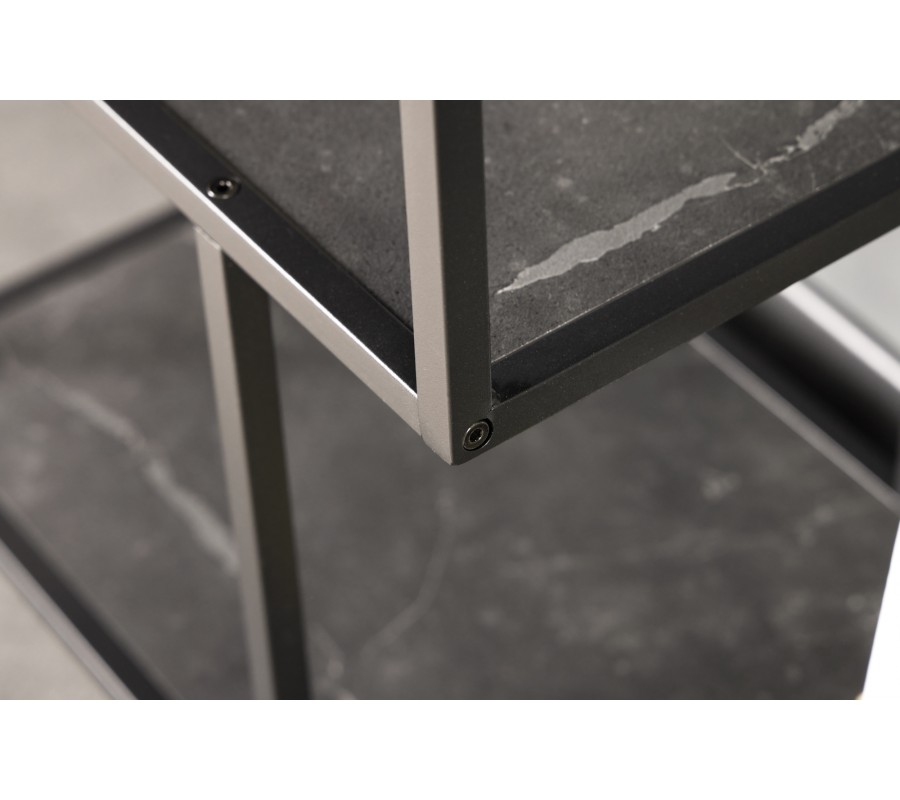 Jeho konštrukcia je zhotovená z kovu s čiernym práškovým nástrekom, ktorý jej dodáva matný vzhľad. Dominujú striktné rovné línie typické pre nábytok v modernom štýle. Výplň políc je z dreva. Ich povrch je lakovaný, v antracitovom sivo čiernom odtieni s mramorovou kresbou.