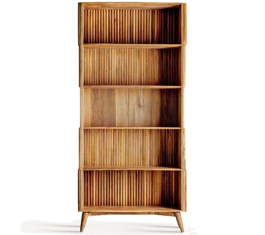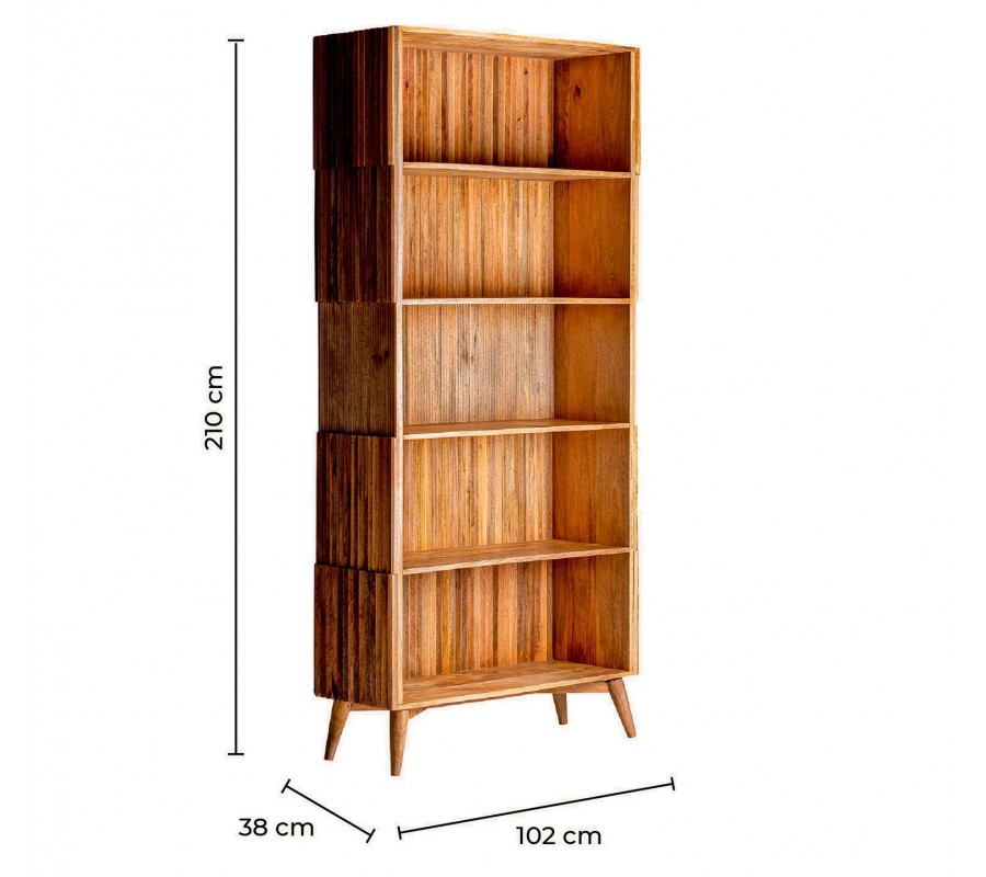 Knižnica je vyrobená z kvalitného mangového dreva, ktoré je veľmi obľúbené vďaka svojej pevnosti a odolnosti. Silueta nábytku je moderná a lineárna, s čím korešponduje aj ozdobný vyrezávaný reliéf v podobe tenkých vertikálnych lamiel na bočných vonkajších stenách a vnútornej zadnej stene. Šírka vzoru v jednotlivých policiach variuje, čo pôsobí dynamickým dojmom.