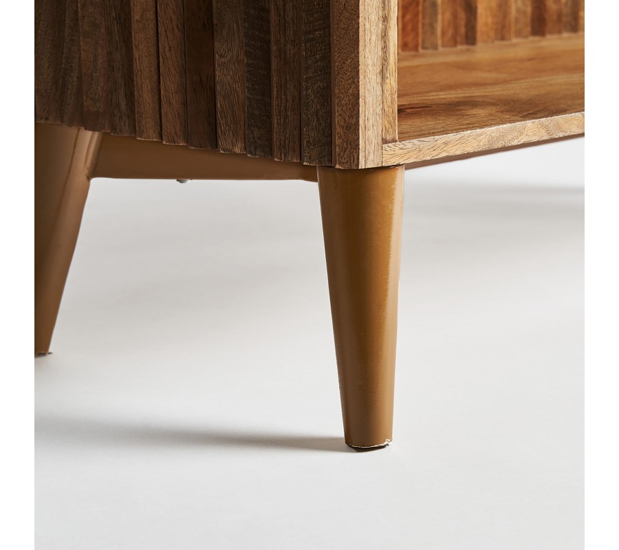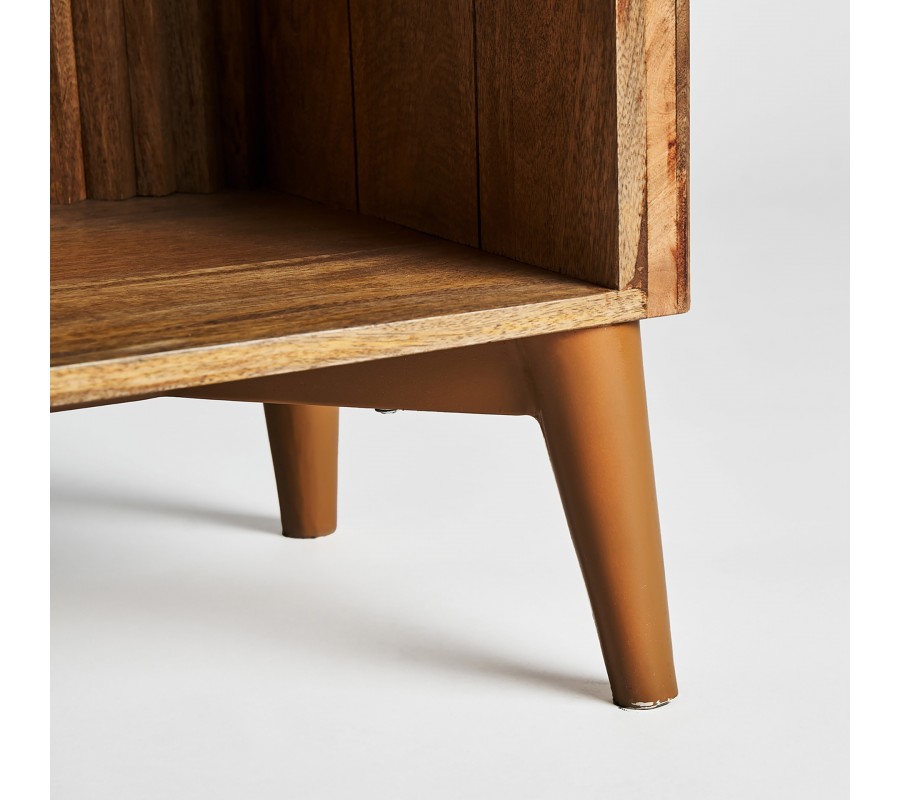 Knižnica je postavená na štyroch zošikmených nožičkách, ktoré majú lesklý povrch v hnedej farbe, korešpondujúcej s paletou naturálnych odtieňov dreva. Mangové drevo má prirodzené teplé odtiene a jeho kresba letokruhov v kombinácii reliéfnym zdobením dodáva nábytku vizuálnu hĺbku.