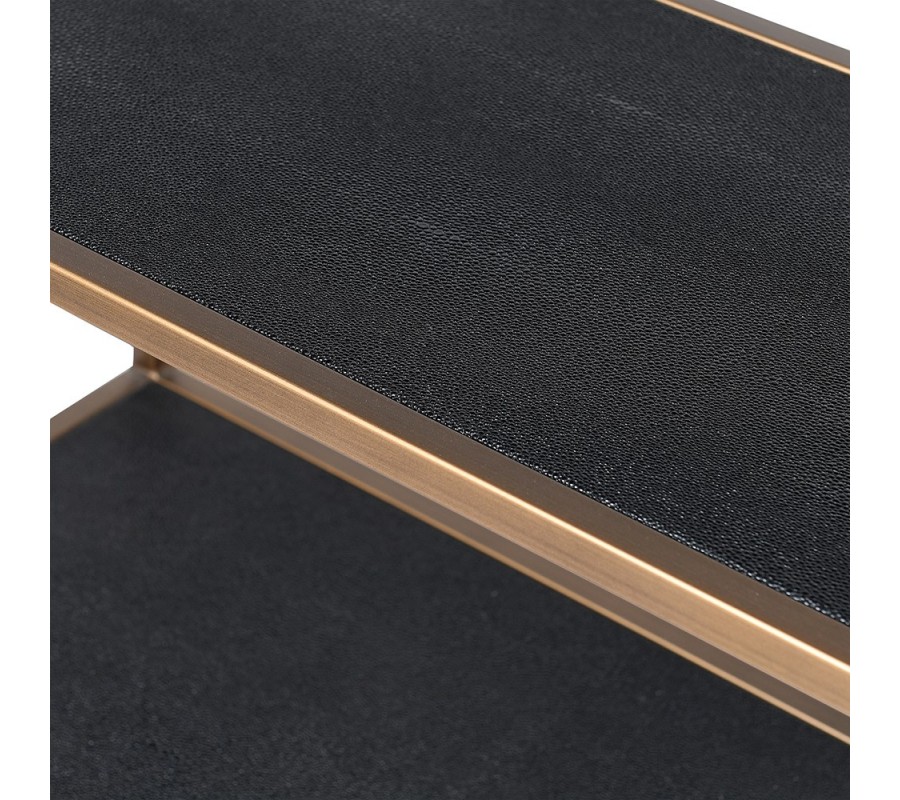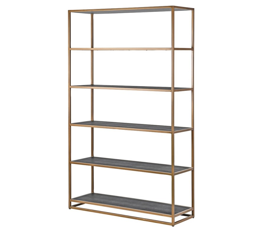 Luxusný art deco regál poskytuje štýlovosť a funkčnosť v jednom. Očarí vás svojím jednoduchým dizajnom v zlatej antickej farbe. Konštrukcia je vyrobená z kovu s matným hladkým povrchom. Regál disponuje piatimi policami, ktoré sú vyrobené z borovicového dreva, ktoré je potiahnuté kvalitnou eko kožou v čiernej farbe. Obdĺžnikový regál sa nesie v jemných rovných líniách s hranatou kovovou konštrukciou.