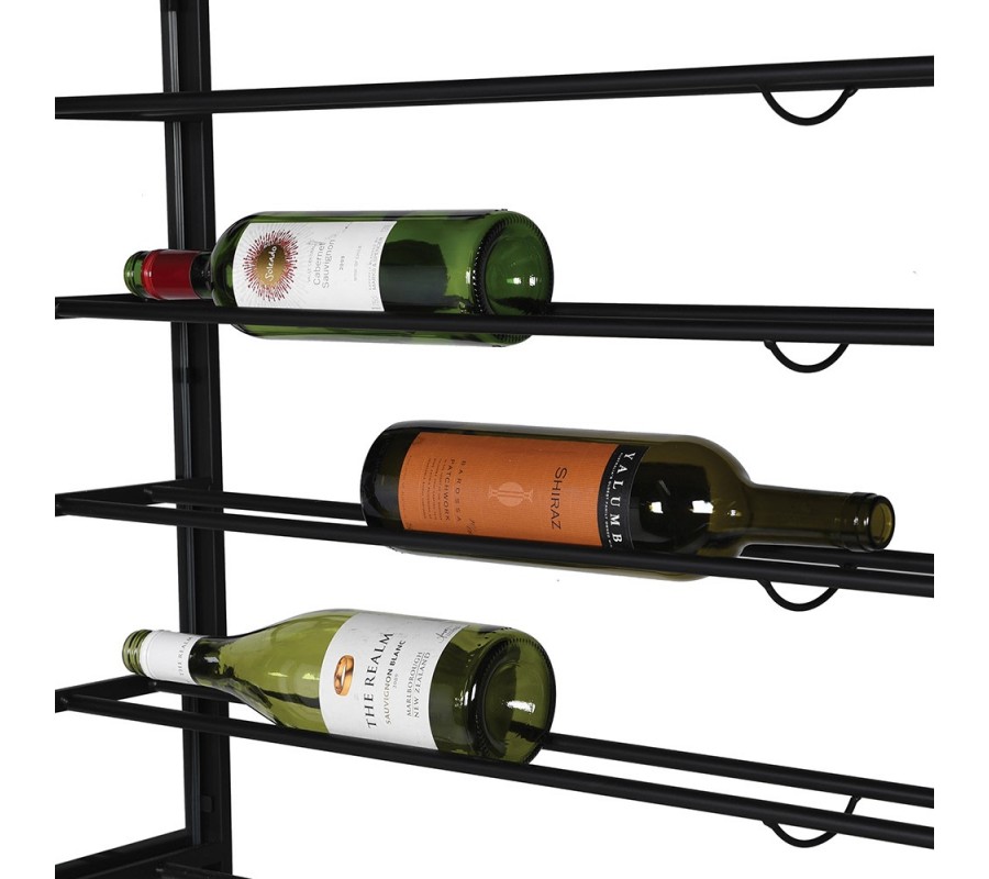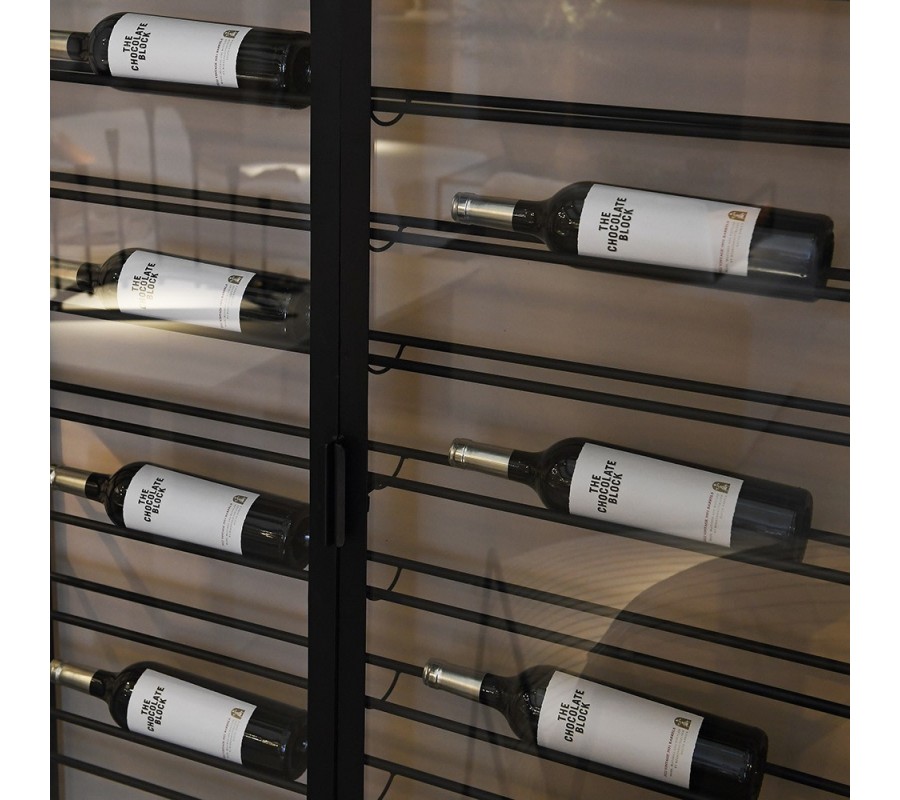 Konštrukcia regálu je vyrobená z kovu a dominujú v nej striktné rovné línie. Každá polica je tvorená dvomi paralelnými tyčami s optimálnym odstupom, ktorý umožňuje praktické a bezpečné uskladnenie fliaš. Úložný priestor je presklený a uzavretý dvojitými dverami bez úchytiek, ktoré podporujú minimalistický vizuál. Sklo má jemné dymové tónovanie, korešpondujúce s čiernou farbou rámu. Regál je postavený na dlhších nožičkách a na bočných stranách tak vzniká zaujímavý rebríkový vizuál.