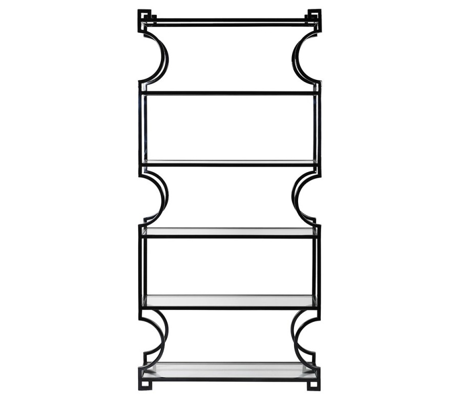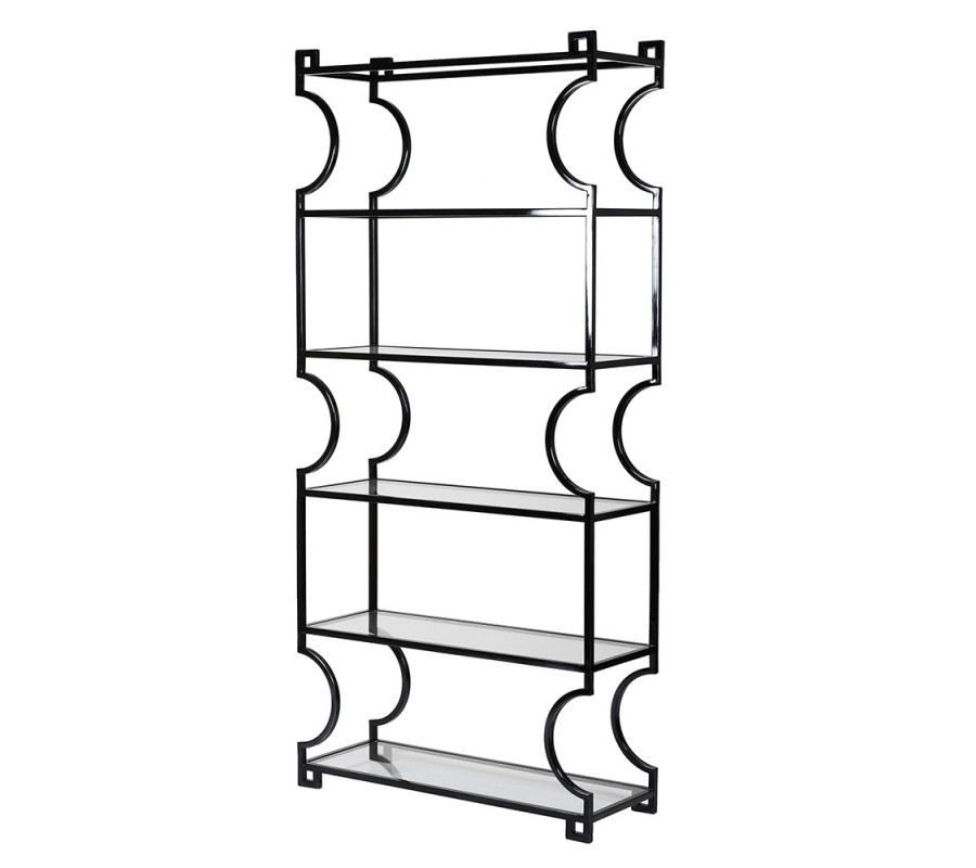 Luxusný art deco regál Eclipse s čiernym kovovým rámom v geometrickom tvare a šiestimi sklenenými policami 215 cm