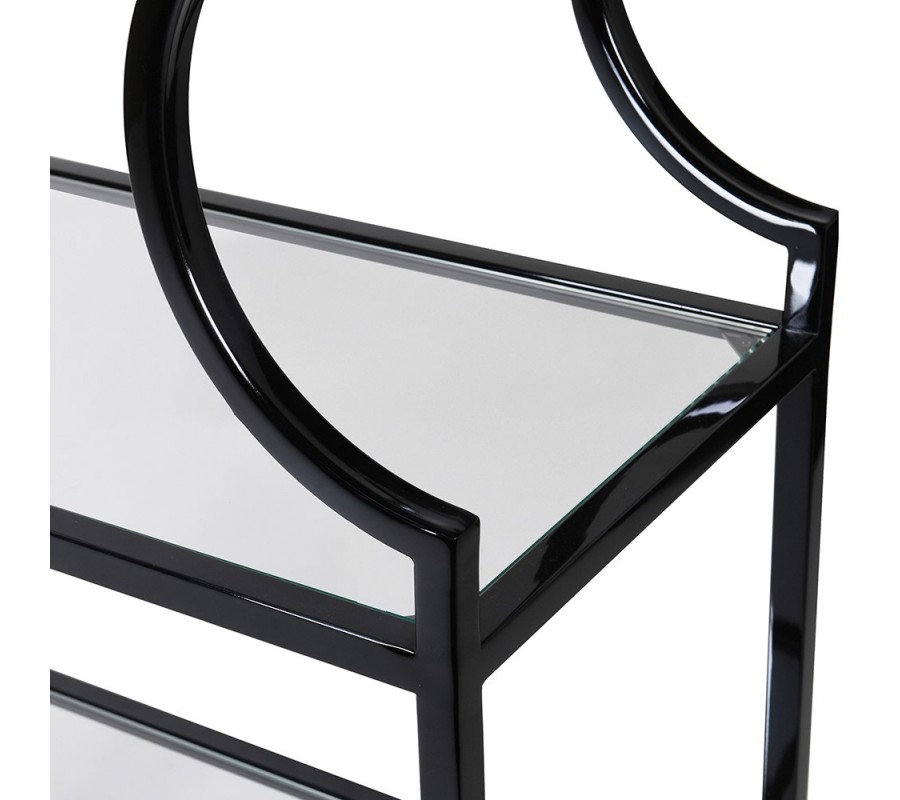 Rám je vyrobený z čiernej nehrdzavejúcej ocele s matnou povrchovou úpravou, ktorá mu dodáva elegantný vzhľad a zaručuje odolnosť. Každá polica je osadená v kovovom ráme, ktorý poskytuje stabilitu a zabezpečuje bezpečné uloženie predmetov. Sklenené police navyše vytvárajú kontrast s čiernym kovovým rámom.