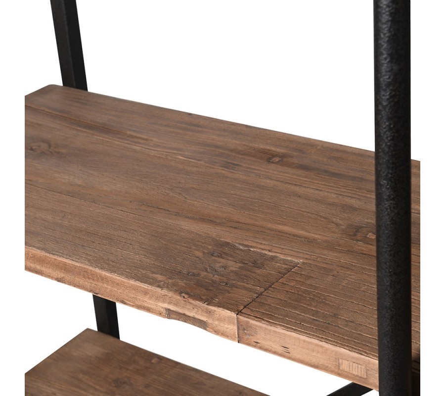 Industriálny obdĺžnikový regál Masill má robustnú konštrukciu s kombináciou drevených políc a kovového rámu. Celkovo obsahuje štyri horizontálne police z masívneho brestového dreva, ktoré majú prírodnú povrchovú úpravu v teplom hnedom odtieni. Kovový rám je čierny, matný, s jednoduchým dizajnom. Stojky regálu sú zvislé a spojené priečnymi výstuhami, vrátane diagonálnych krížení na zadnej strane, ktoré zvyšujú stabilitu a zároveň dodávajú charakteristický industriálny vzhľad.