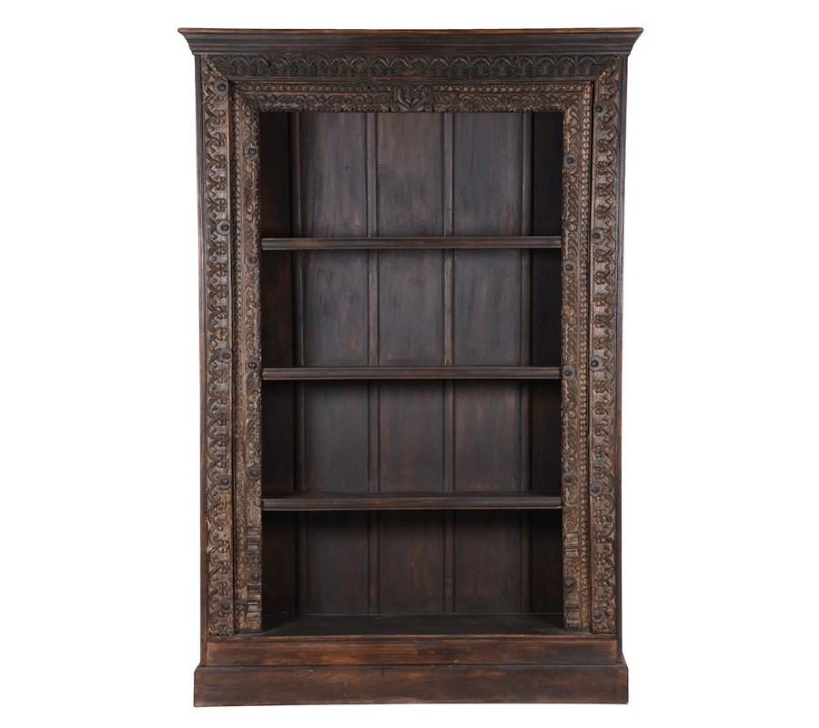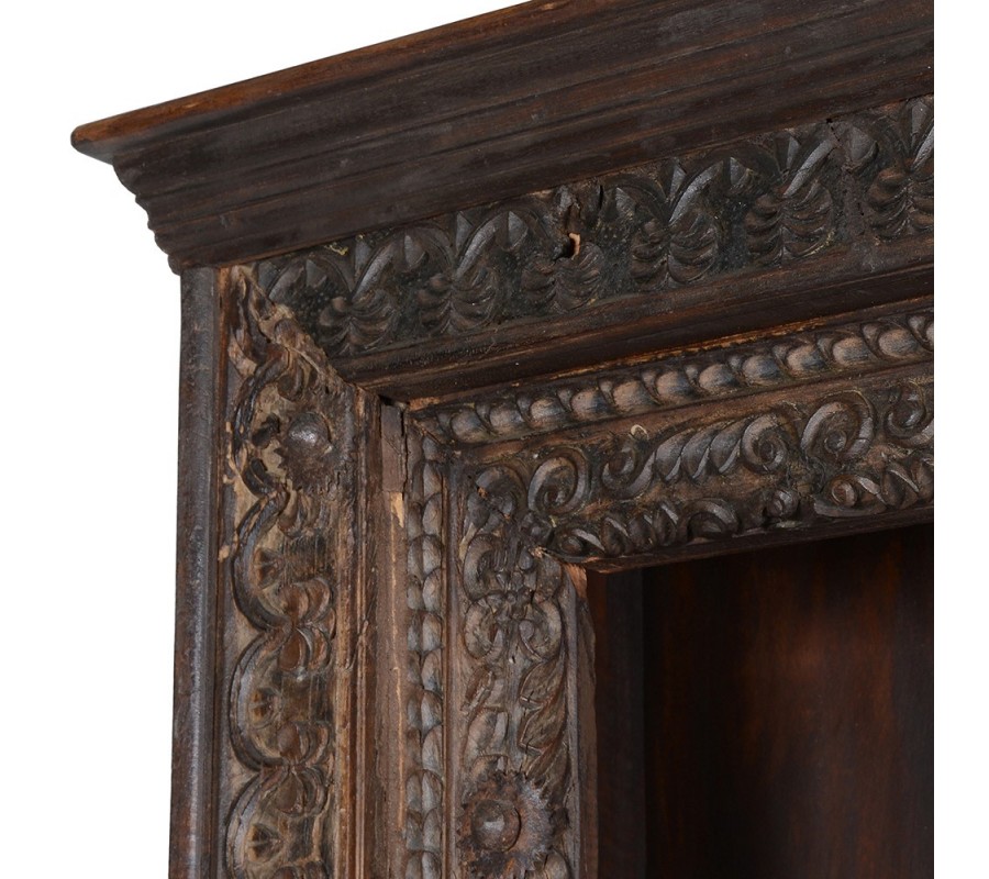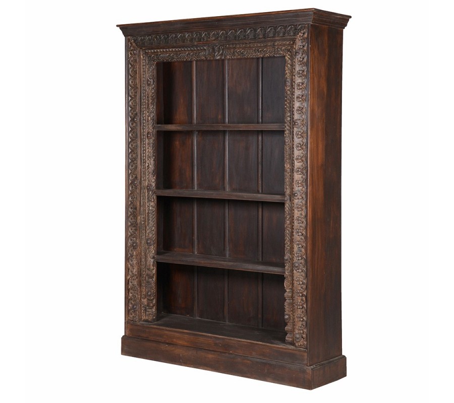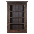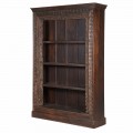 Konštrukcia je pevná a rám vyrobený z masívneho dreva má zaoblené hrany. Povrch v tmavohnedom prevedení zvýrazňuje prirodzenú štruktúru materiálu, zatiaľ čo patina umocňuje jeho vintage charakter. Ornamenty na ráme, inšpirované prírodnými motívmi ako lístky a kvetinové vzory, sú precízne vyrezávané, čím zdôrazňujú remeselnú hodnotu a robia z knižnice unikátny kúsok.