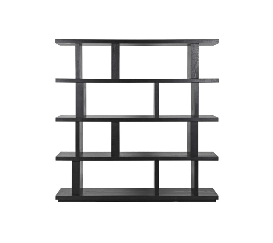K dispozícii je celkovo 16 poličiek, 8 vnútorných hlbokých poličiek a 8 menších okrajových, ktoré poskytujú dostatok priestoru na uloženie kníh, dekorácií, rastlín či ďalších drobností. Povrch regálu je hladký s viditeľnou kresbou dreva, čo podčiarkuje prirodzenú krásu materiálu. Farba je matná čierna, ktorá sa hodí do moderných aj industriálnych priestorov.