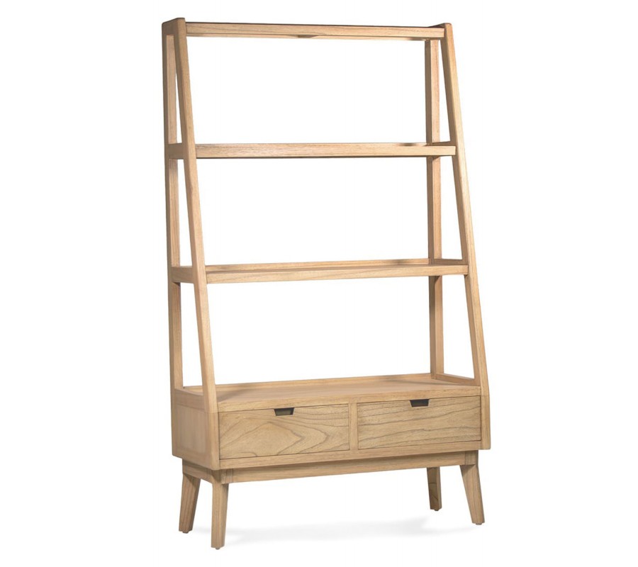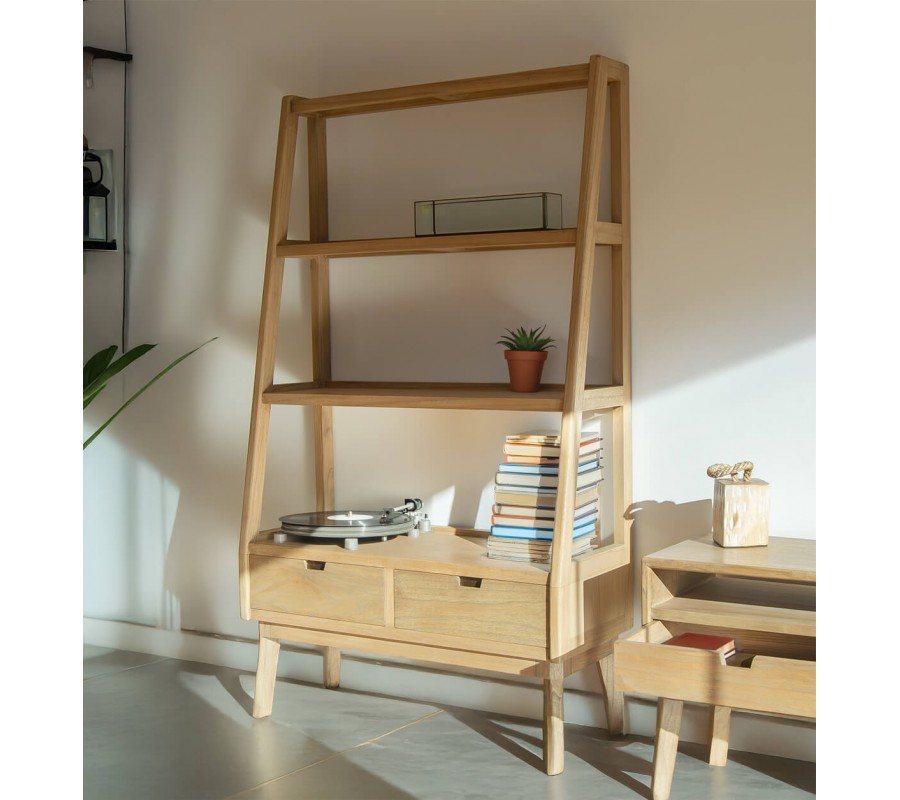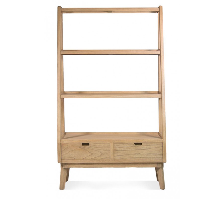 Severská dizajnová knižnica Bergen z masívneho dreva mindi v hnedej farbe s otvorenými troma policami a dvoma zásuvkami 170 cm