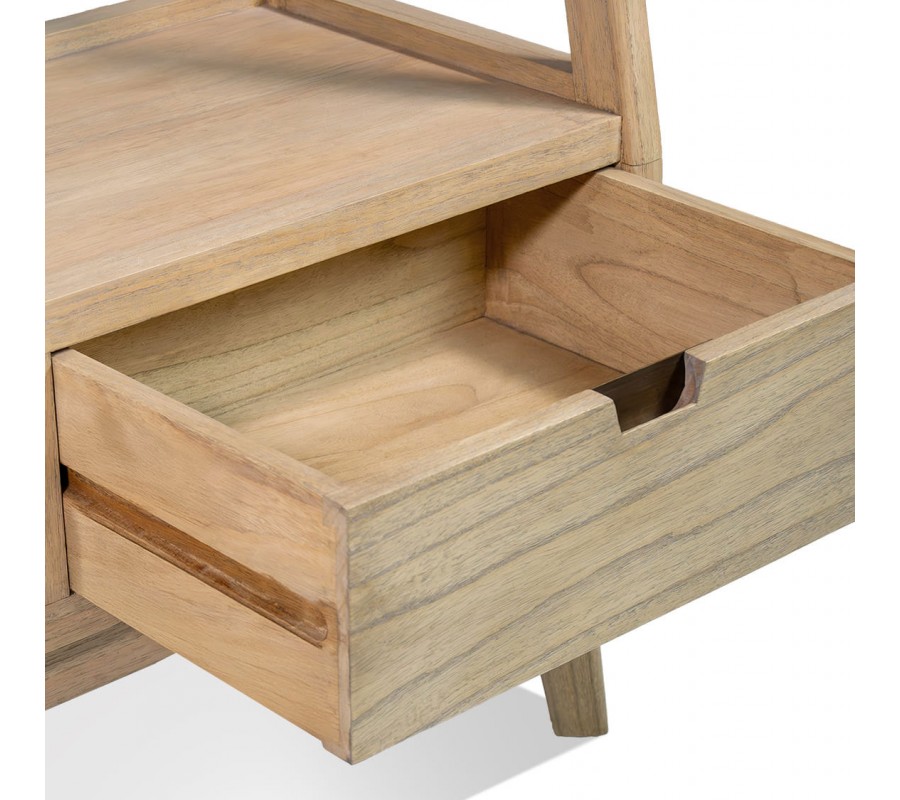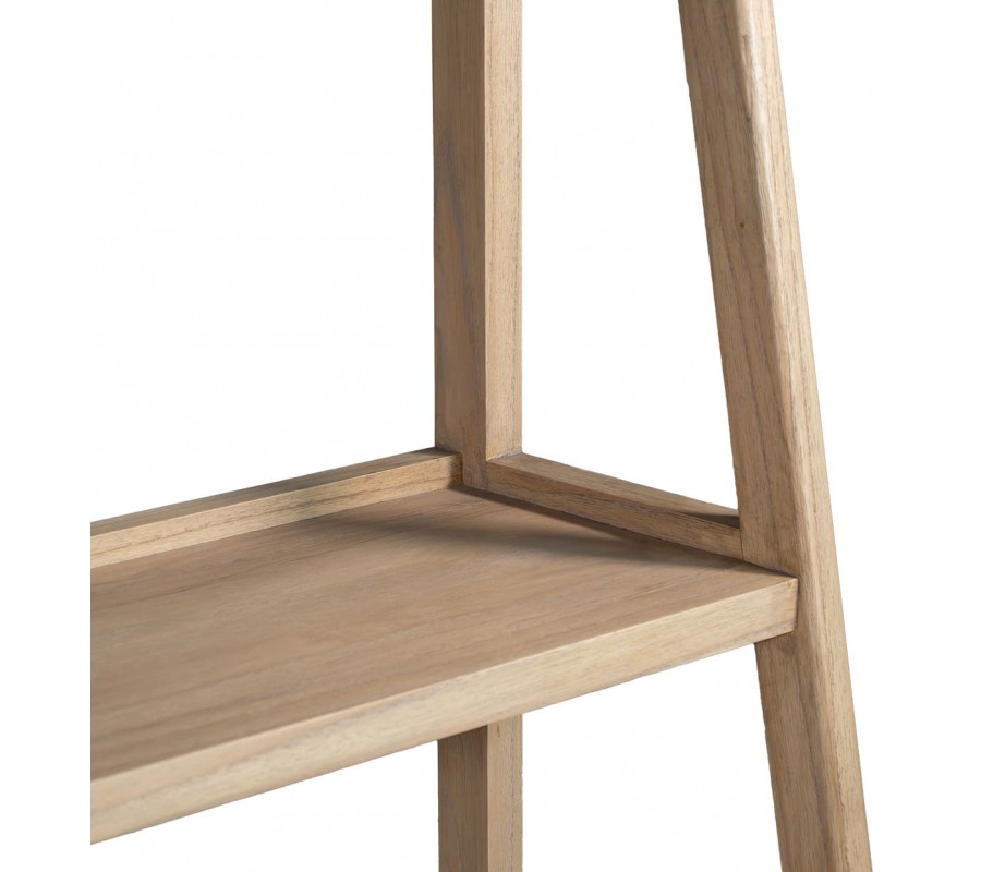 Knižnica má charakteristický šikmý rám, rebríkový dizajn dodáva dynamiku a moderný vzhľad. Police sa smerom nahor postupne zužujú. Tri otvorené police poskytujú priestor na vystavenie obľúbených predmetov, zatiaľ čo spodná časť obsahuje dve zásuvky bez úchytiek, ktoré sa otvárajú pomocou praktických výrezov. Nožičky sú štíhle, jemne zošikmené a vyrobené z rovnakého masívneho dreva, čo podčiarkuje prirodzenú estetiku nábytku. Knižnica Bergen patrí do škandinávskeho štýlu bývania, ktorý kladie dôraz na funkčnosť, jednoduchosť a prírodné materiály.